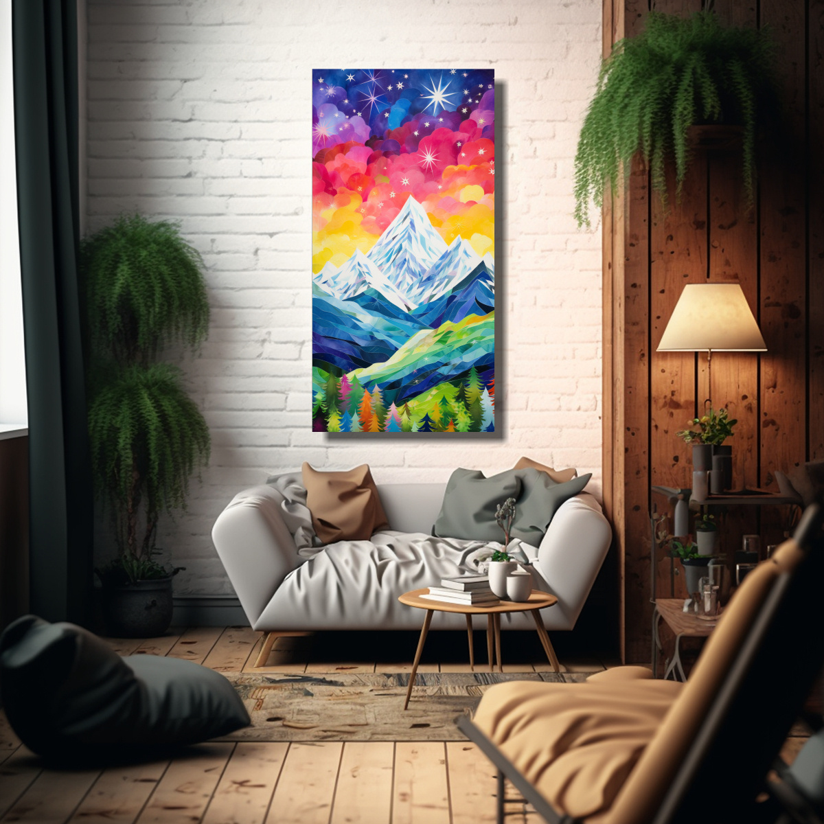 Este cuadro decorativo de paisaje montañoso con estilo elegante sería perfecto para colocar en el salón de tu hogar Combina colores cálidos como el carmesí y la mostaza con tonos fríos como el verde azulado y el turquesa, logrando así una atmosfera equilibrada y relajante Colócalo sobre un sofá de tonos neutros y acompáñalo con cojines en los mismos colores del cuadro para una decoración armoniosa