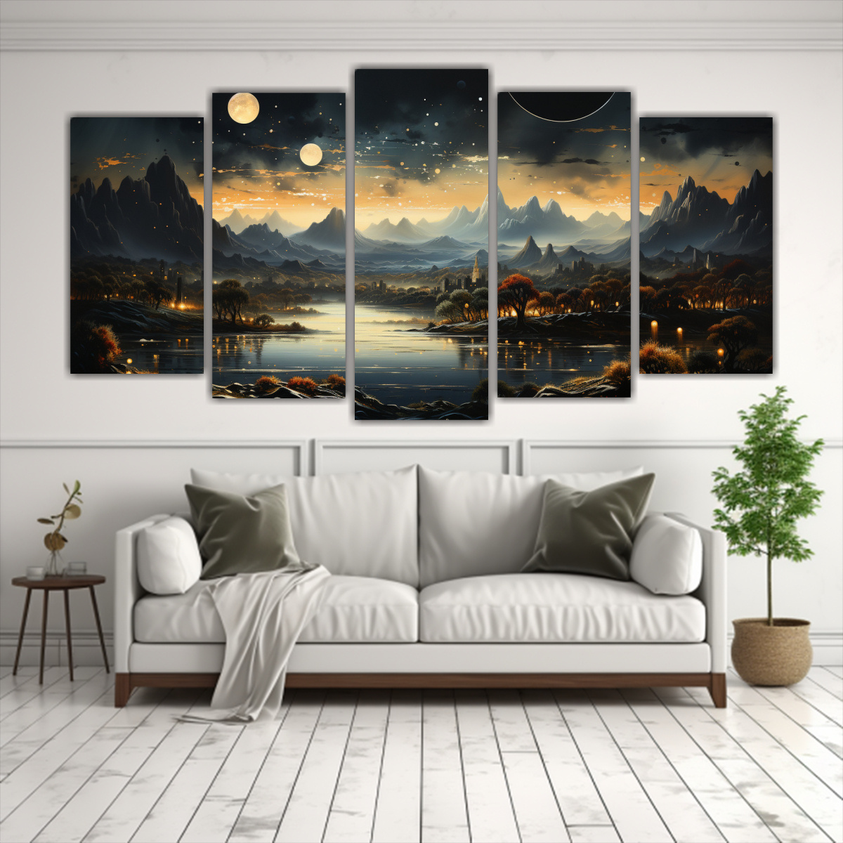 Paisaje De Montaña Con Fases De La Luna Y Cielo Nocturno Dorado Pinturas Inspiradas En La Fantasía En Lienzo