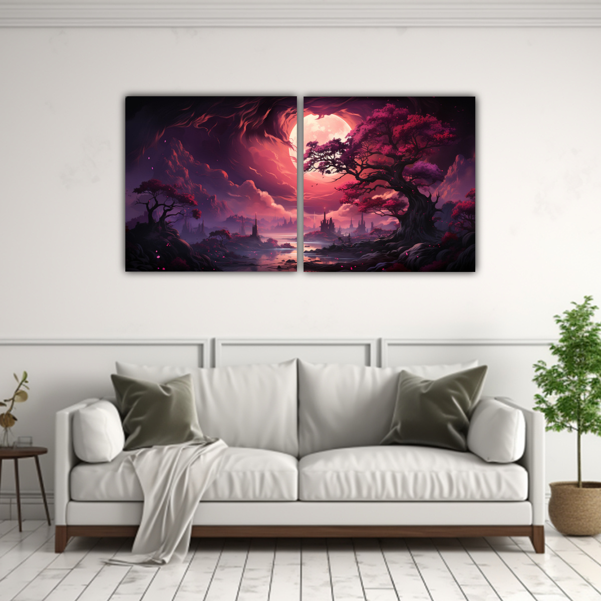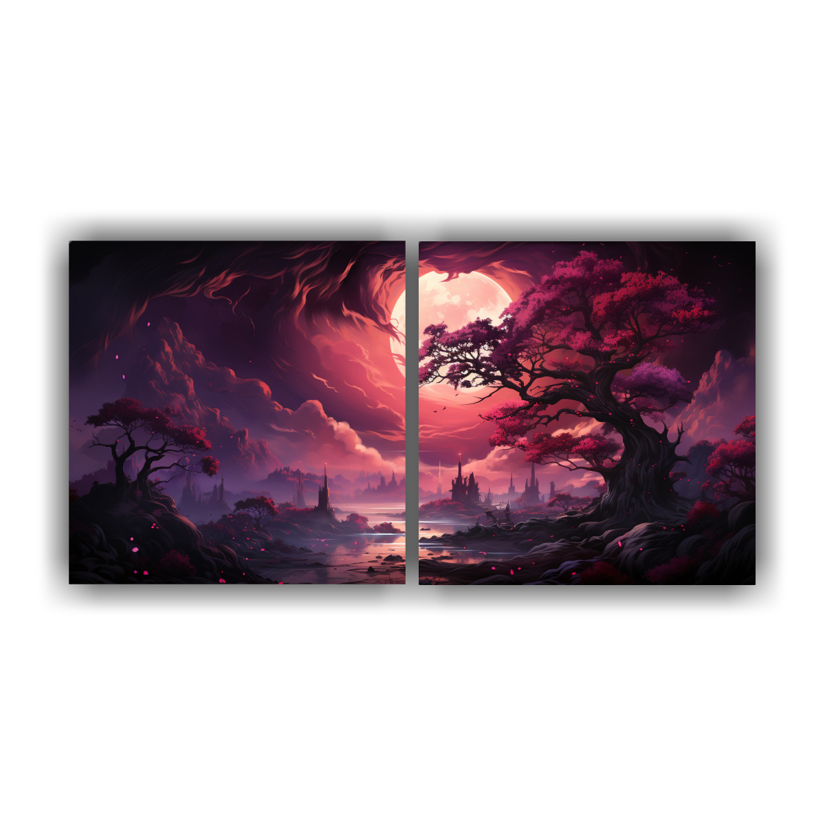 DecoCuadros tiene a tu disposición el cuadro Paisaje Duradero en Morados y Rojos con Árbol de Acebo en Ambiente Neonoir Impreso en tela de alta calidad con bastidores de madera Envío gratis en Santiago y envíos express a regiones