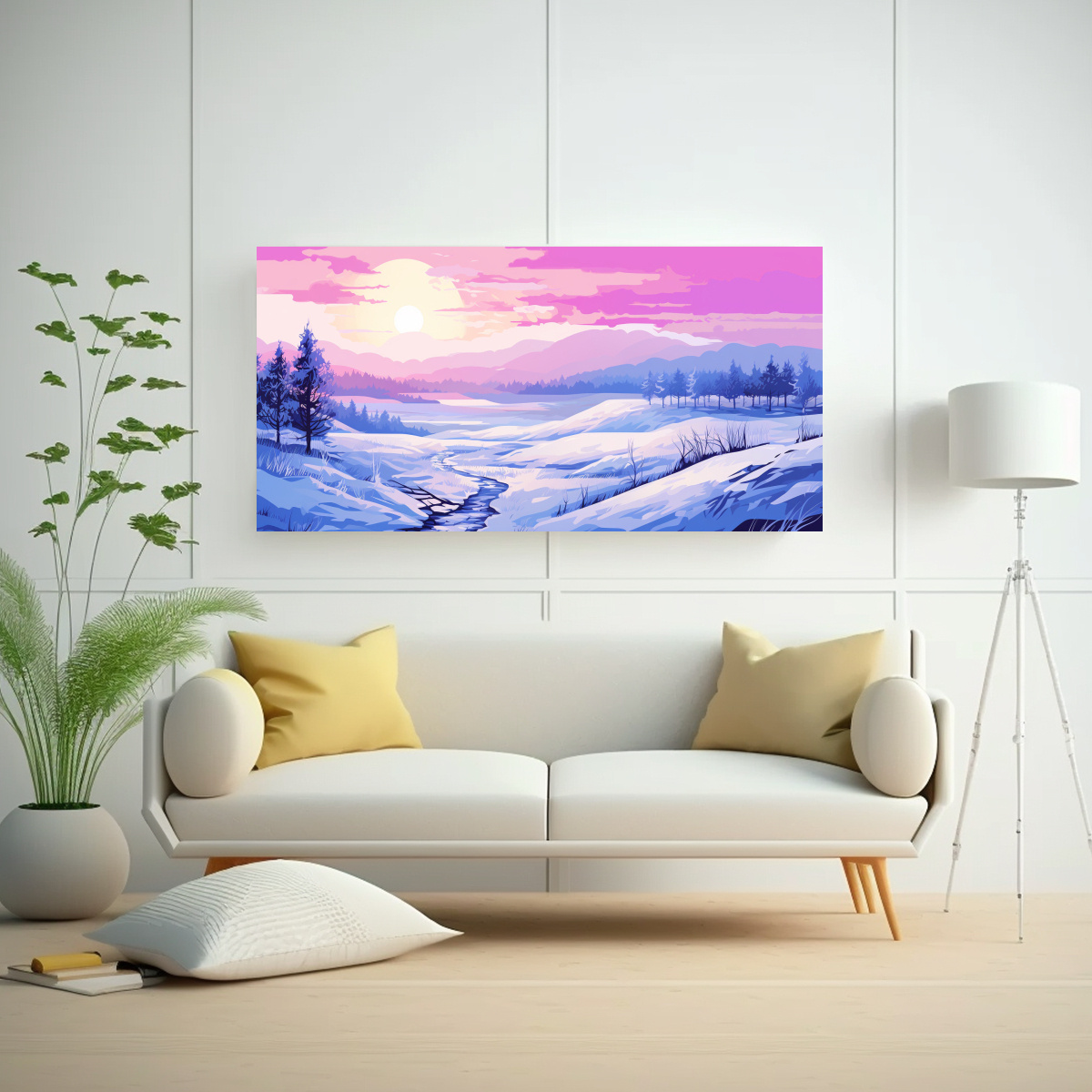 Este cuadro ‘Paisaje Invernal con Colores Púrpuras’ sería ideal para colocar en el salón principal de tu hogar, sobre un sofá en tonos neutros para resaltar la vivacidad de los colores Combínalo con cojines en tonos beige, lila o turquesa para lograr un ambiente armonioso y acogedor ¡Dale vida a tu sala con este cuadro exclusivo de DecoCuadros!
