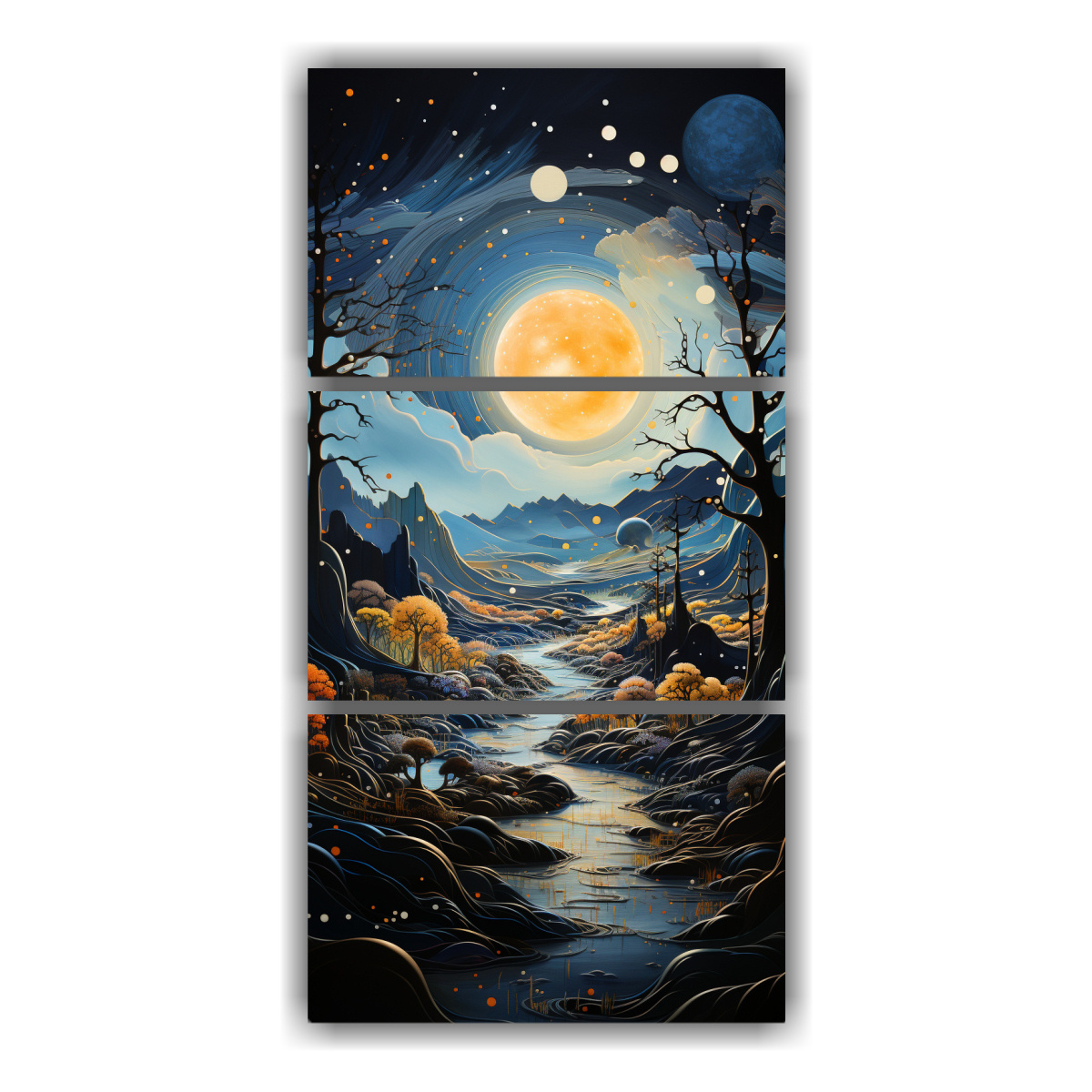 Paisaje Lunar En Las Montañas: Tres Telas En Bastidor Vintage