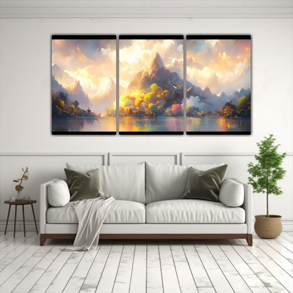 Paisaje Montañas Lago Arcoíris Y Amarillo: Tríptico Decorativo.