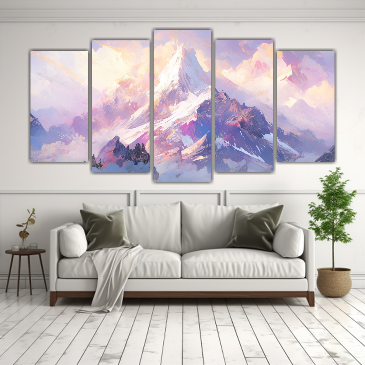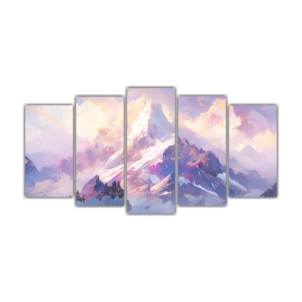 Este cuadro Paisaje Nevado Arcoíris y Púrpura en 5 lienzos es perfecto para darle un toque de elegancia y color a tu sala de estar, dormitorio o incluso a tu oficina Combina a la perfección con muebles de tonos neutros para resaltar su belleza y brillo