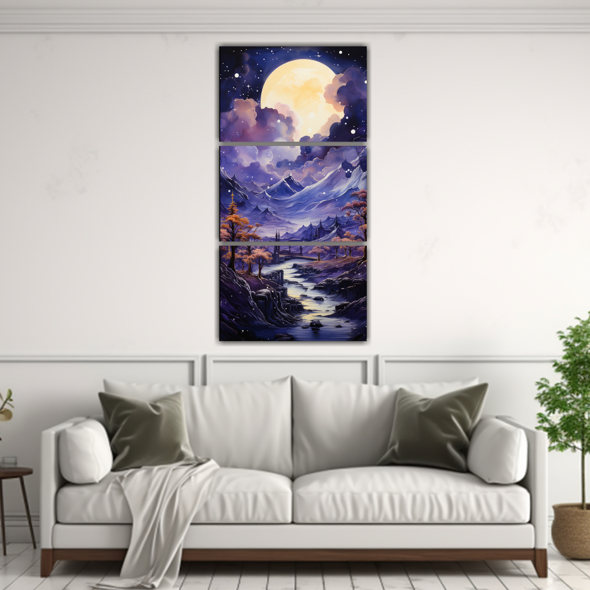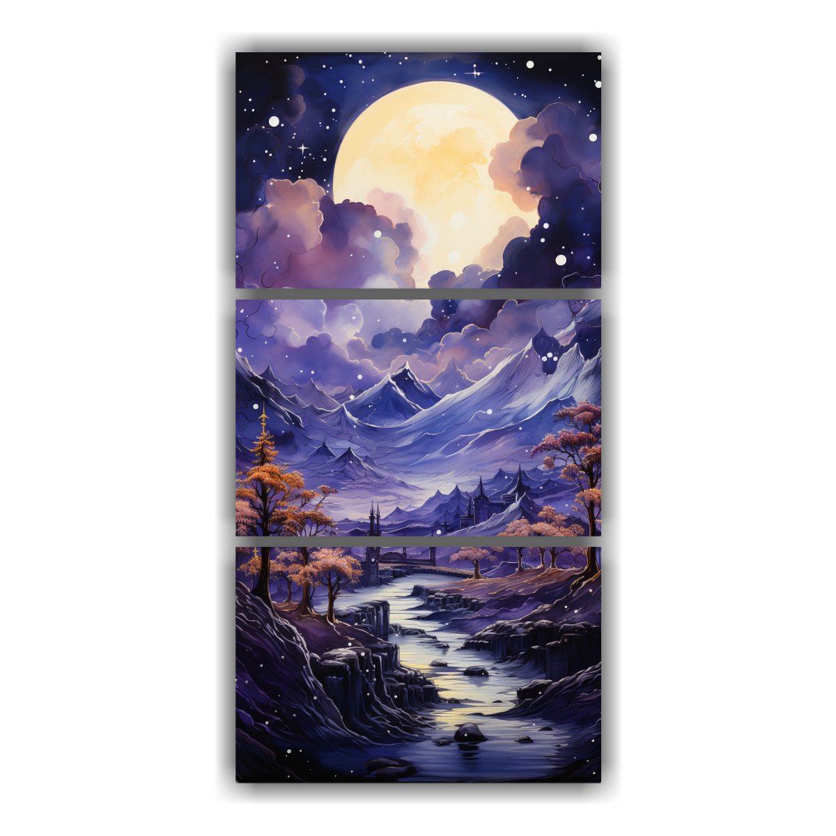 El cuadro Paisaje nocturno con luna y montañas, también conocido como tríptico Patron intenso Enigmatico, es una obra de arte que combina los tonos Azul Marino grisaceo, Plateado, Negro, Gris, Lila, Carmesi y Coral Confeccionado con tela de alta calidad y bastidores de madera, este cuadro ofrece la mejor calidad del mercado a precios económicos Además, en DecoCuadros contamos con diseños exclusivos y ofrecemos entregas rápidas y gratuitas en Santiago, así como envíos exprés a regiones