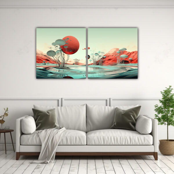Este cuadro de paisaje onírico surrealista sería perfecto para decorar tu sala de estar Colócalo sobre un sofá gris o blanco para resaltar sus colores vibrantes Combínalo con cojines en tonos plateados y turquesas para lograr una armonía visual ¡Añade un toque de vanguardia y elegancia a tu espacio con este cuadro único!