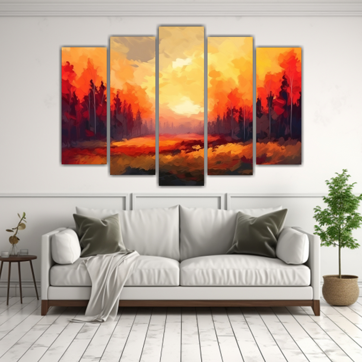 Para realzar la belleza del cuadro ‘Paisaje Otoñal Abstracto’, te recomendamos colocarlo en la pared principal de tu sala de estar, sobre un sofá de tonos crema o beige Acompáñalo con cojines en colores cálidos y una lámpara de pie dorada para crear un ambiente acogedor y elegante