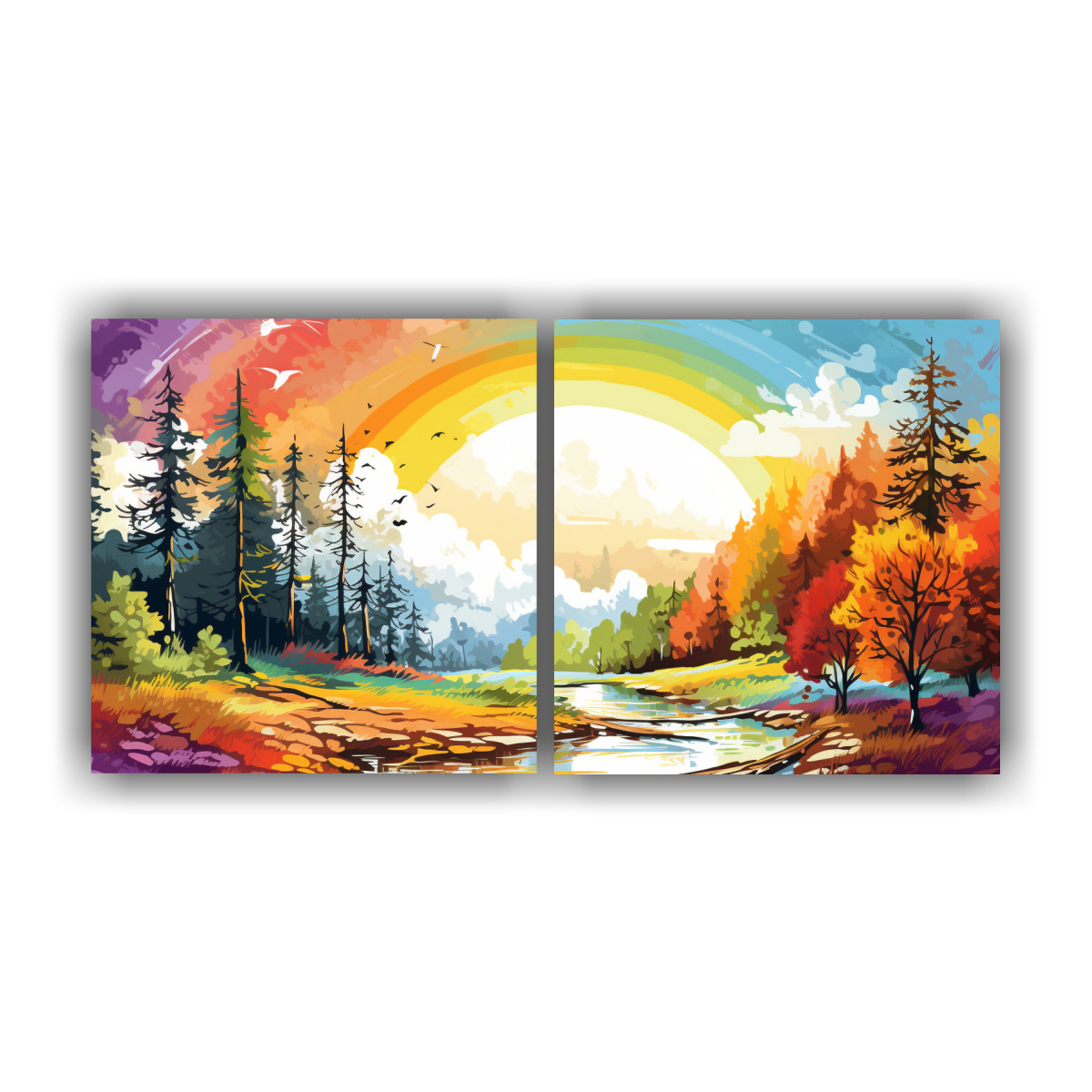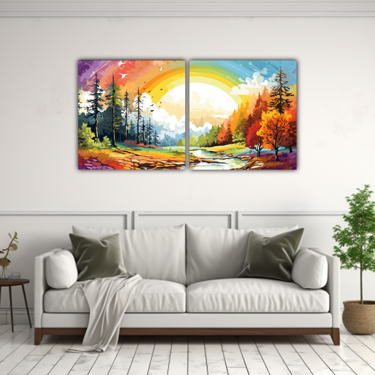 Este cuadro Paisaje Otoñal con Colores Arcoíris queda perfecto en el salón principal sobre un sofá gris para resaltar los tonos de la imagen y crear un ambiente acogedor y moderno Complementa con cojines en tonos coral y dorado para una decoración armoniosa