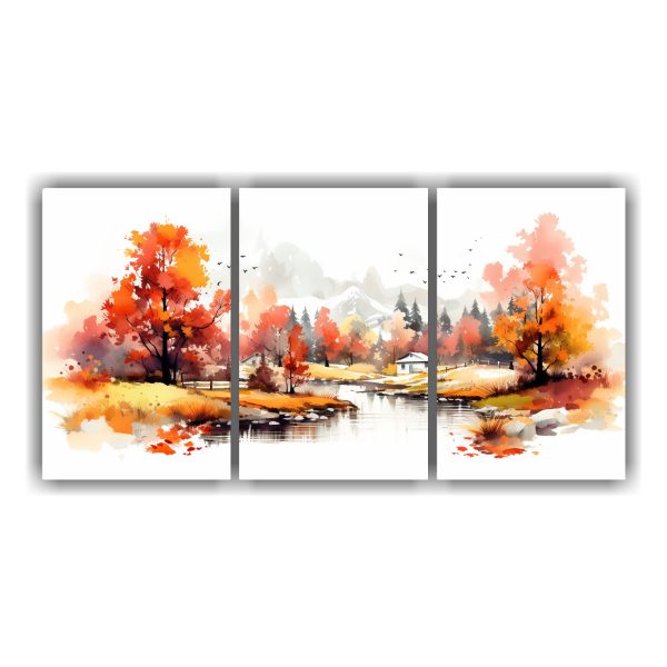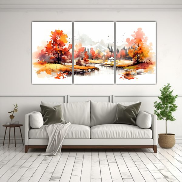 Paisaje Otoñal Elegante Con Acuarelas De Tres Lienzos