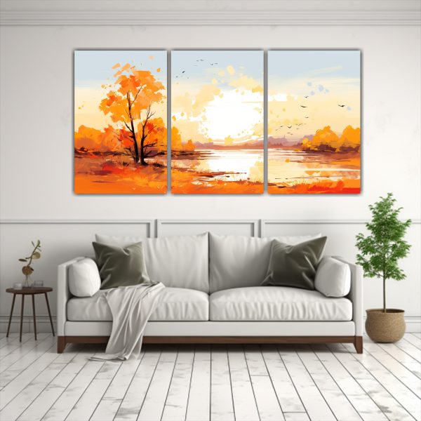 Este cuadro se vería perfecto en la sala de estar sobre un sofá de color neutro para resaltar sus tonos naranjas y amarillos Combínalo con cojines en tonos beige y dorado para crear un ambiente armonioso y acogedor ¡Transforma tu espacio con este cuadro único!
