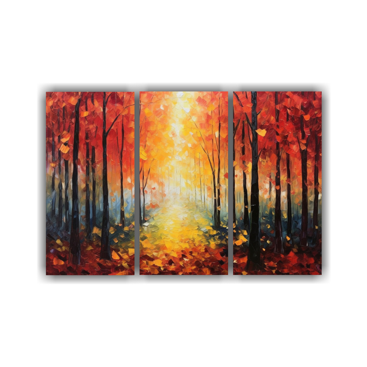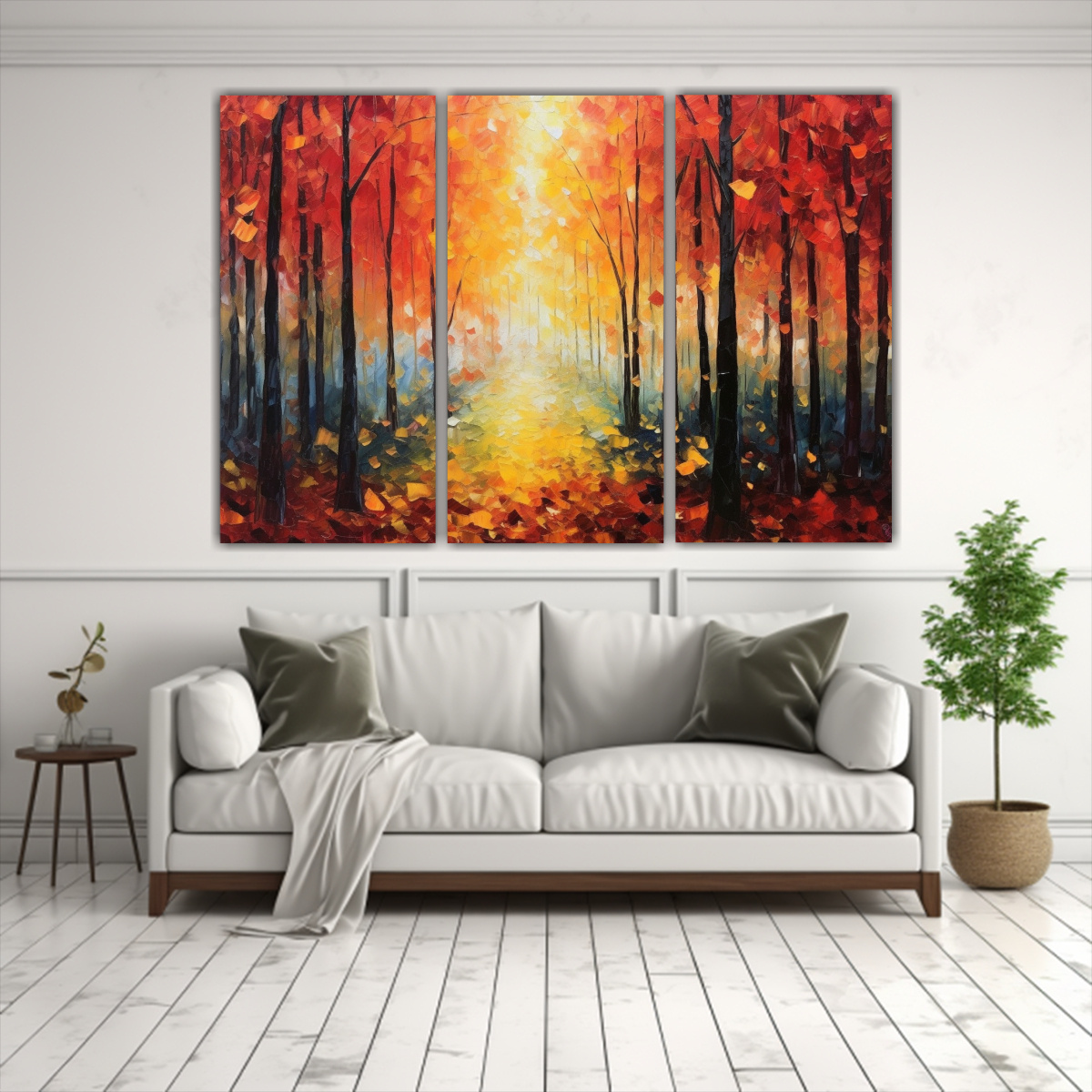 Este cuadro paisaje otoñal vibrante es perfecto para destacar en tu sala de estar Colócalo sobre un sofá gris para resaltar los tonos cálidos y crear un ambiente acogedor Combínalo con cojines amarillos y una alfombra en tonos coral para una decoración moderna y elegante