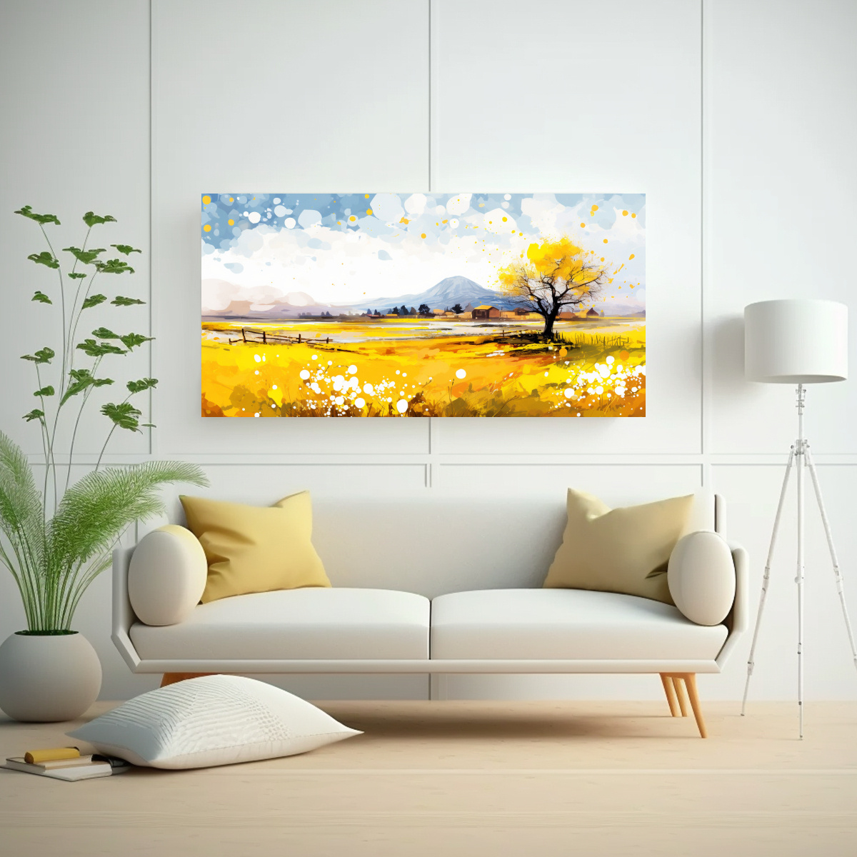 El cuadro Fine Art Finas Lineas Ambiente Spring season landscape with Yellow Colors neo pop art 2baf63b9-e1a5-4d8e-967c-eee5320483ea es perfecto para añadir un toque de frescura y vitalidad a tu sala de estar o estudio Combínalo con muebles en tonos neutros para resaltar su vibrante paleta de colores y crear un ambiente moderno y sofisticado