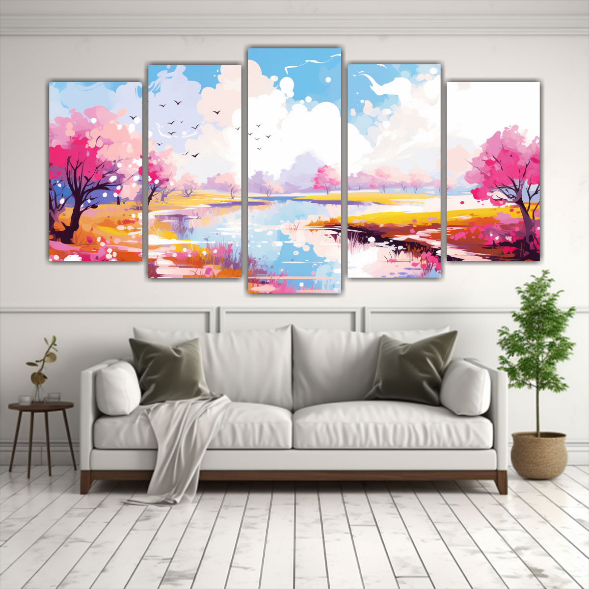 Coloca este cuadro en la sala de estar sobre un sofá beige para resaltar los colores carmesí, coral y amarillo claro Complementa la decoración con cojines en tonos lila, turquesa y gris para crear un ambiente armonioso y primaveral ¡Dale vida a tu espacio con este paisaje primaveral con colores blancos!