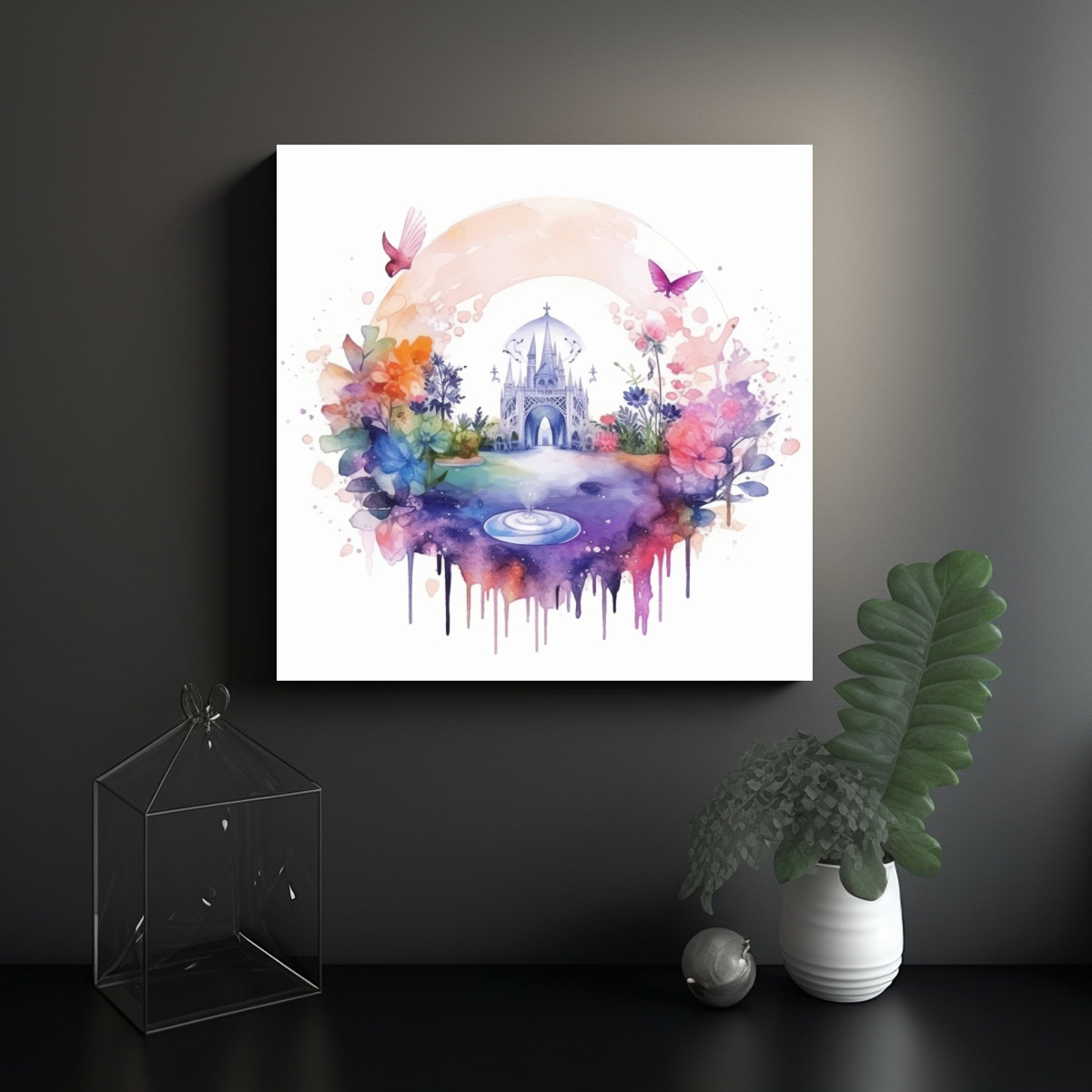 Este cuadro Paisaje Primaveral Realista con textura mágica en acuarela se vería espectacular en la sala de estar, sobre un sofá en tonos neutros para resaltar los colores del cuadro Combínalo con cojines en tonos gris y lila para una decoración armoniosa y elegante