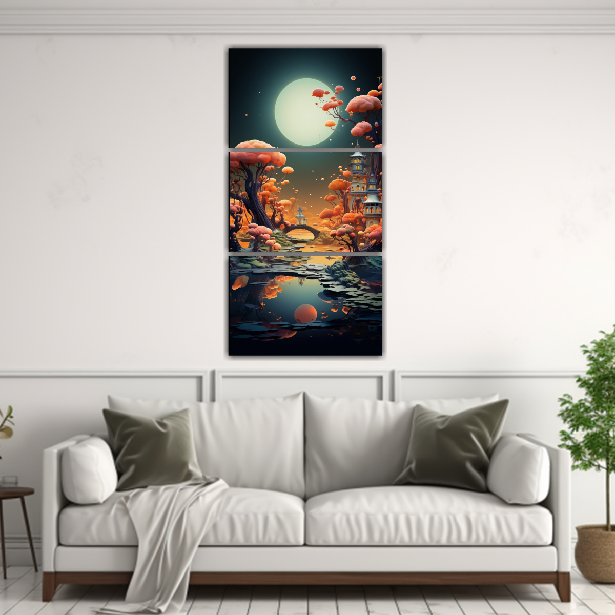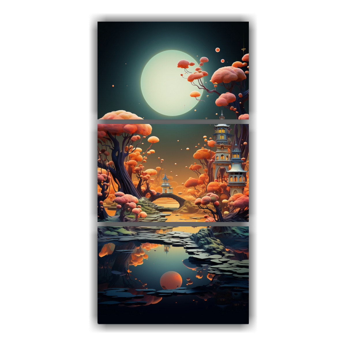 Renueva tus espacios con este set de 3 lienzos modernos de paisaje surrealista con islas flotantes Los colores coral, negro, dorado, plateado, gris, azul marino grisáceo y carmesí se combinan de manera armoniosa y única en esta obra de arte Nuestros cuadros decorativos impresos en tela de alta calidad con bastidores de madera destacan por su durabilidad y resistencia Además, ofrecemos los precios más económicos del mercado y diseños exclusivos que no encontrarás en ninguna otra tienda No pierdas la oportunidad de aprovechar nuestras entregas rápidas y gratuitas en Santiago, y envío express a regiones