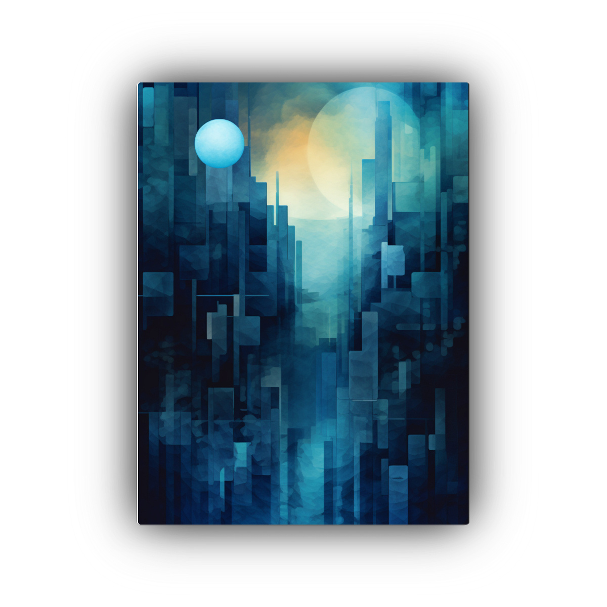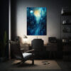 Descubre el paisaje surrealista innovador con niebla iluminada por la luna y tonos azules profundos, un cuadro que transformará tu espacio en un ambiente mágico y encantador Impreso en tela de alta calidad, con bastidores de madera y colores plateado, turquesa, azul marino grisáceo, verde azulado, gris, menta y negro, este cuadro es perfecto para agregar un toque de elegancia y misterio a tu decoración