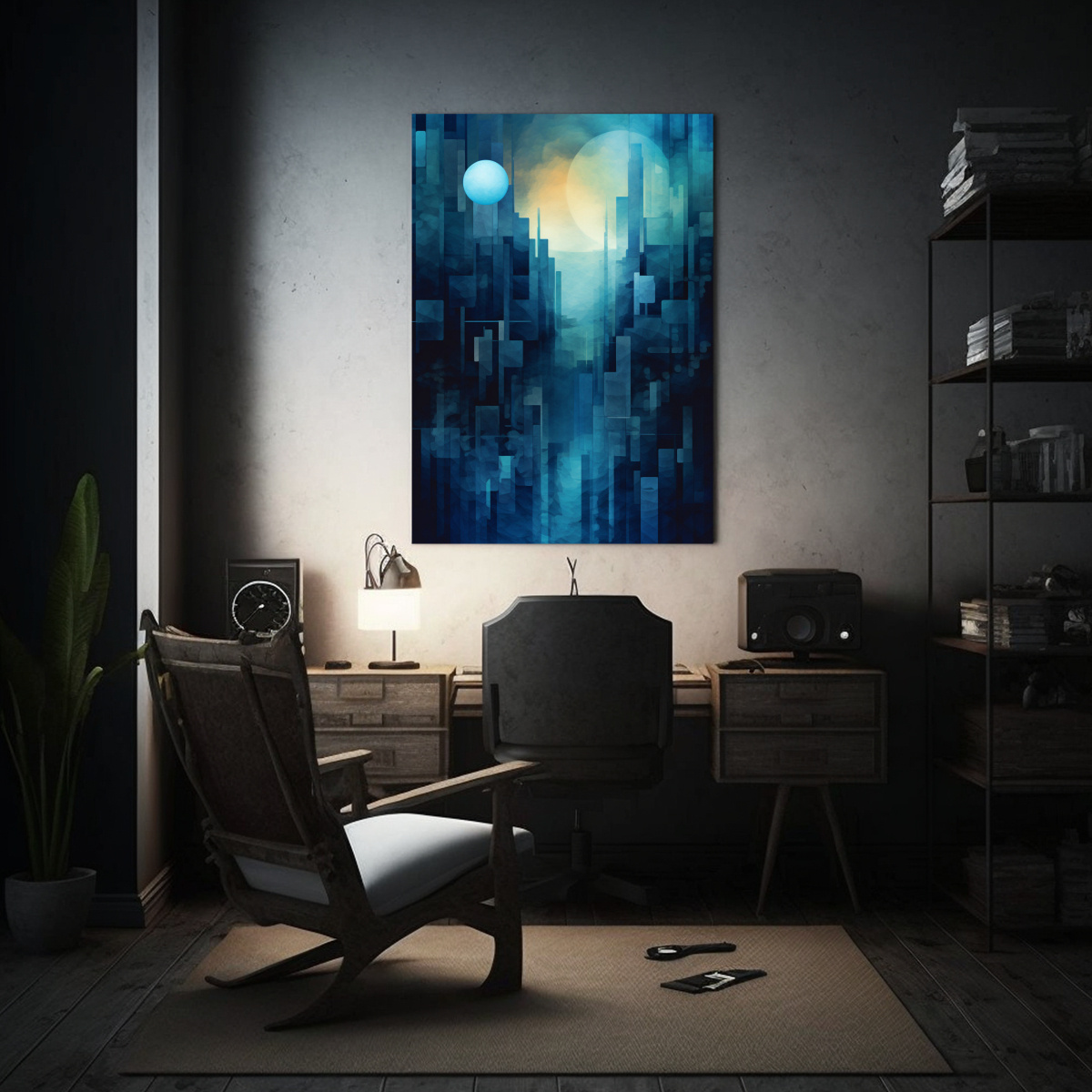 Este cuadro se verá espectacular en tu sala de estar, sobre un sofá en tonos neutros como gris o blanco Las tonalidades azules del cuadro crearán un contraste armonioso y relajante Combínalo con cojines en tonos turquesa o menta para completar la decoración ¡Será el punto focal de tu espacio!