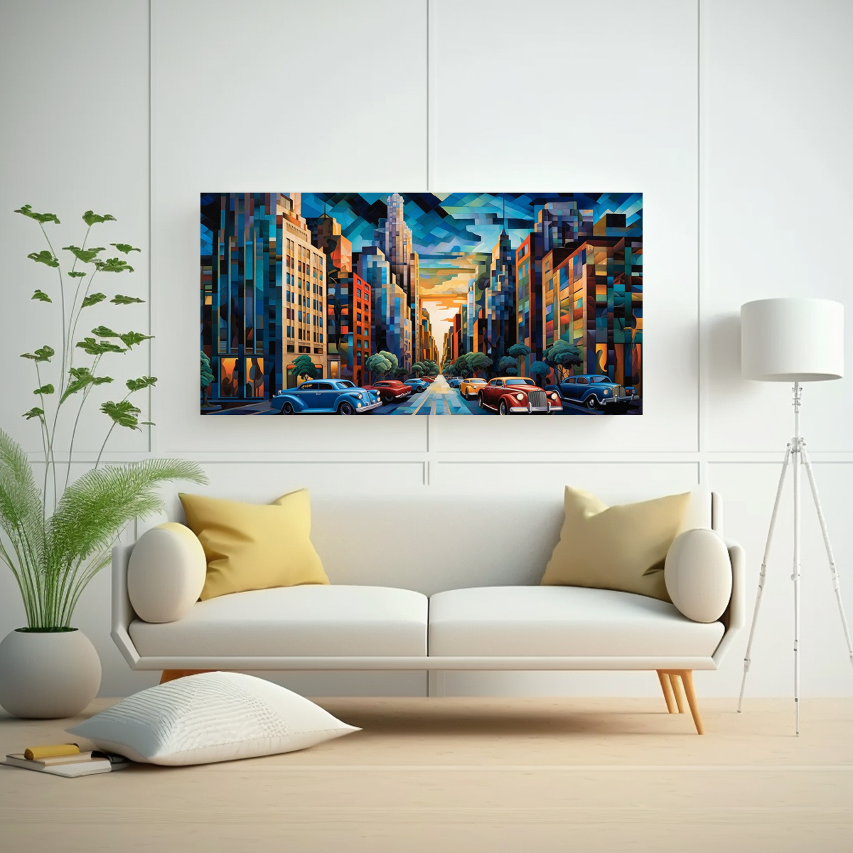 Este cuadro Paisaje Urbano al Atardecer es perfecto para realzar la decoración de tu sala de estar Colócalo sobre un sofá en tonos neutros para contrastar y crear un punto focal en la habitación, añadiendo cojines en tonos Coral y Turquesa para una armonía visual completa
