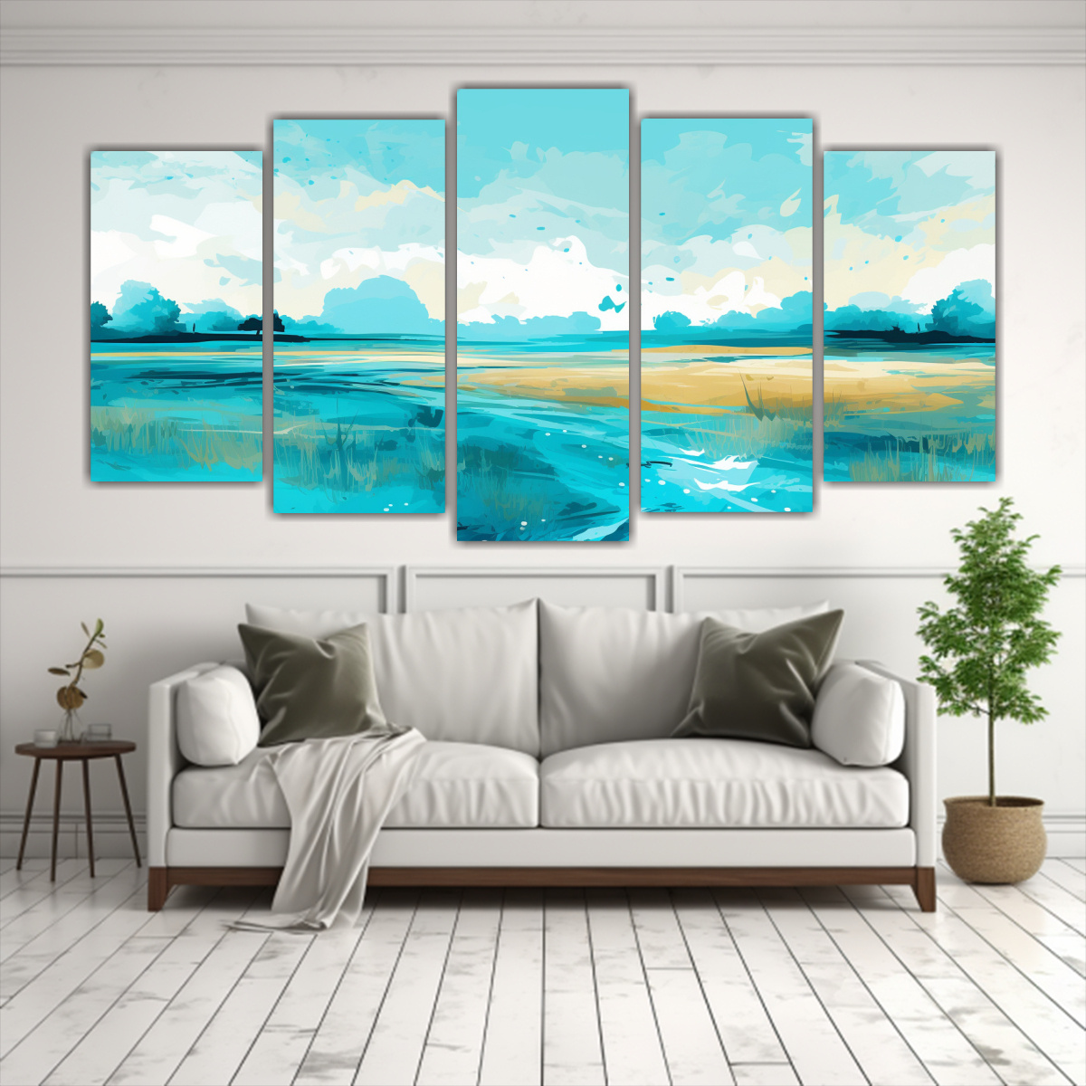 Coloca este cuadro paisaje verano con colores turquesa pop neo en el centro de tu sala de estar para crear un punto focal vibrante Combínalo con cojines en tonos turquesa y beige, así como plantas en macetas de colores vivos para lograr un ambiente fresco y acogedor