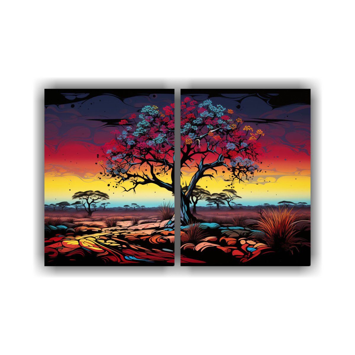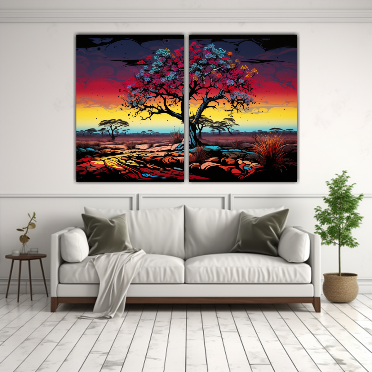 Agrega un toque de elegancia y modernidad a tu hogar con este set de 2 telas en bastidor impreso de un árbol en sabana y desierto con tonos vibrantes neo-noir Envío gratuito en Santiago y express a regiones
