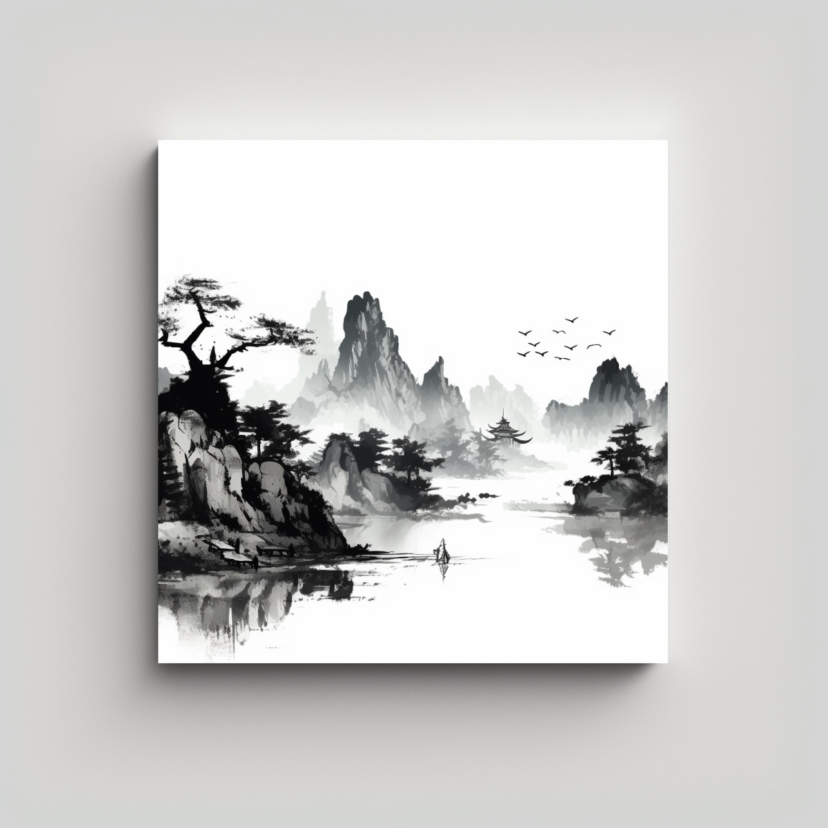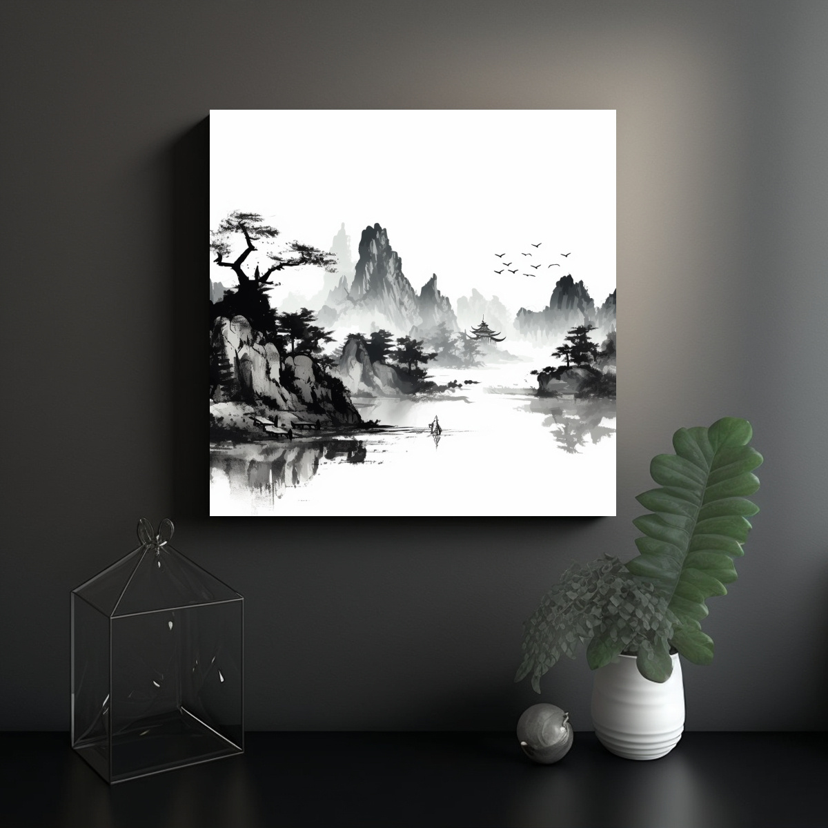 Este cuadro Paisajes de tinta con diseño simple es perfecto para realzar la elegancia de tu sala de estar Colócalo sobre un sofá beige para crear un contraste sofisticado Complementa con cojines en tonos grises y plateados para una decoración armoniosa