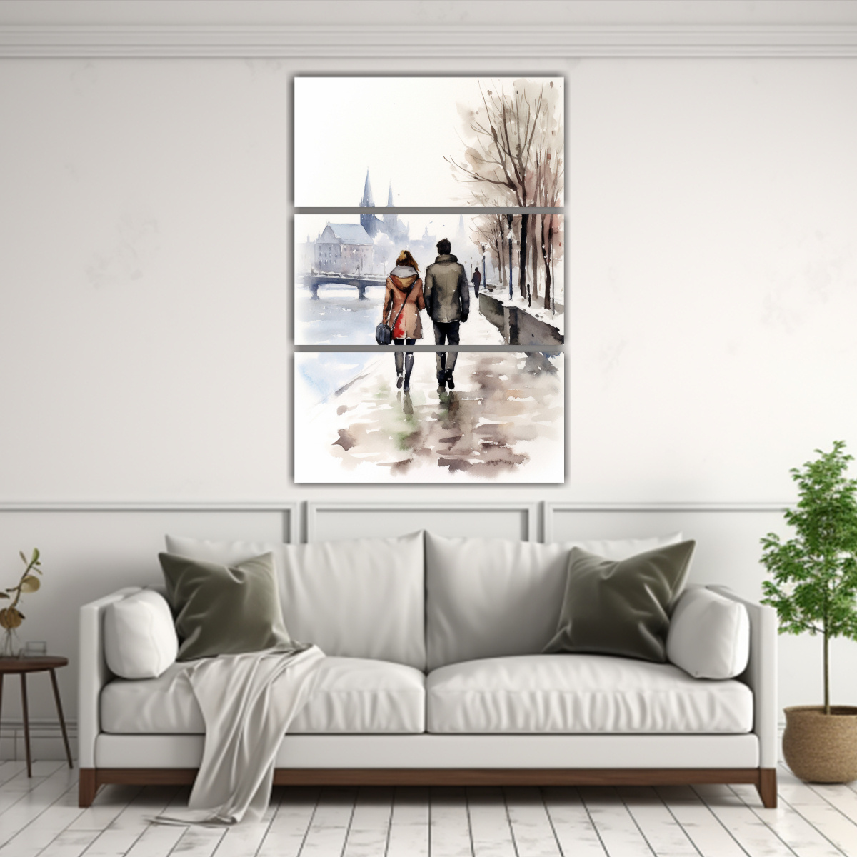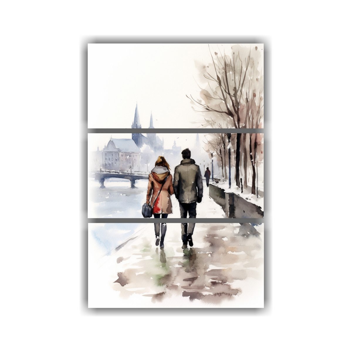DecoCuadros ofrece cuadros decorativos impresos en tela de alta calidad con bastidores de madera Nuestro cuadro ‘Pareja caminando en invierno, acuarela’ es perfecto para darle un toque elegante y romántico a tu hogar Con colores como el Azul Marino grisaceo, Beige, Gris y Plateado, este cuadro combinará a la perfección con cualquier estilo de decoración Además, contamos con los precios más económicos del mercado y entregas rápidas y gratuitas en Santiago, así como envíos a regiones express No pierdas la oportunidad de adquirir un diseño exclusivo de nuestra tienda