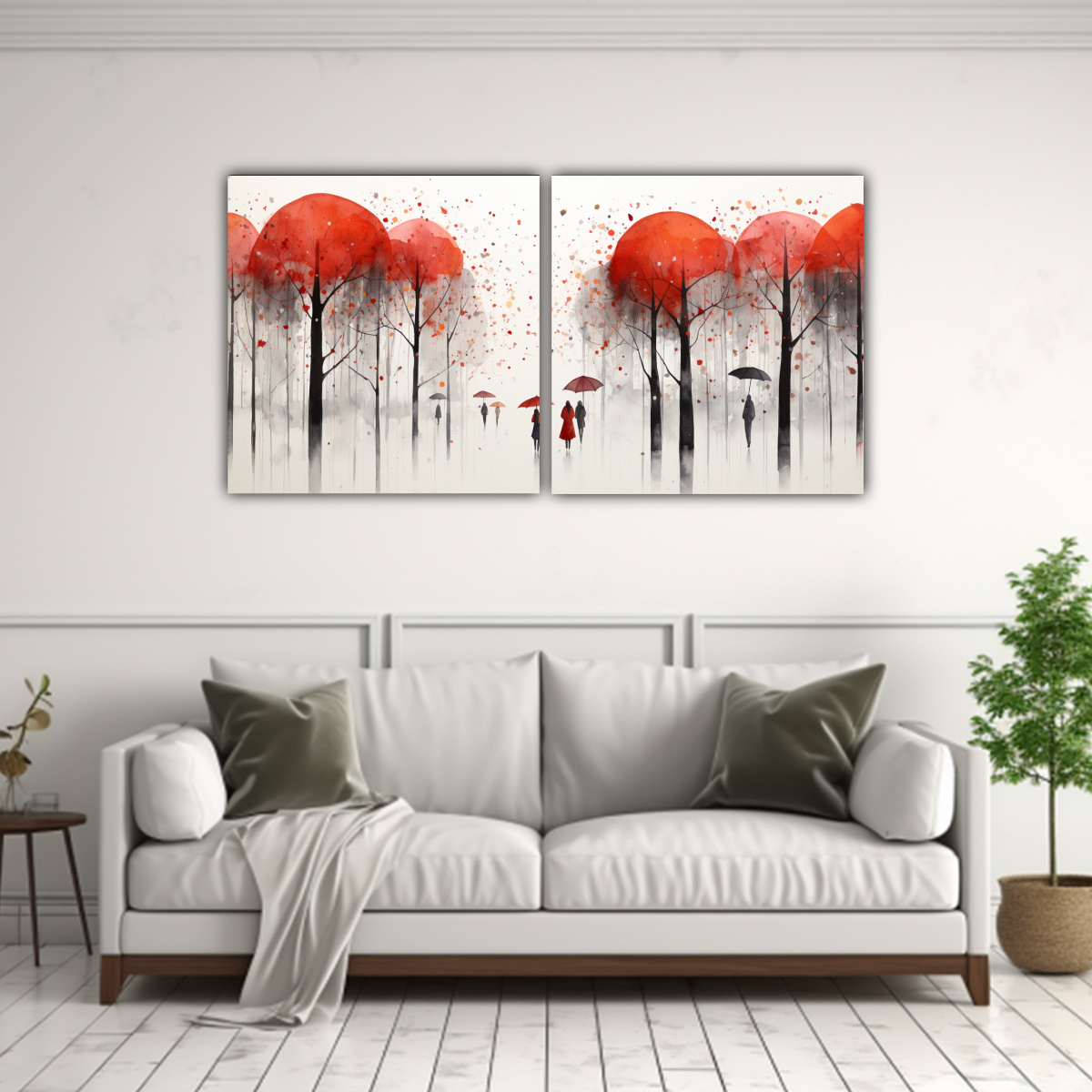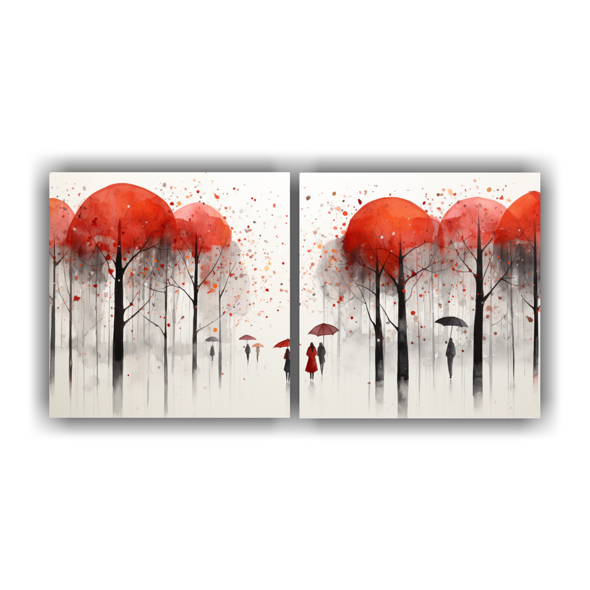 DecoCuadros presenta el cuadro Parejas bajo la lluvia en bastidor, arte simétrico Disponible en diferentes colores: Beige, Azul Marino grisaceo, Carmesí, Gris, Coral, Plateado, Lila, Dorado Impreso en tela de alta calidad con bastidores de madera Añade un toque elegante y moderno a tu hogar