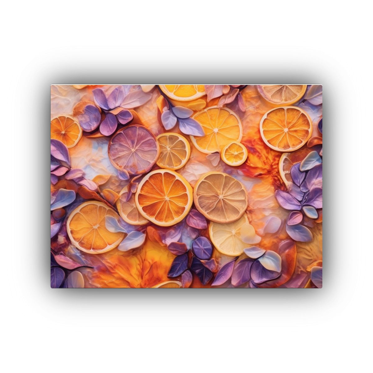 Este cuadro se vería perfecto en la sala de estar sobre un sofá de color neutro, resaltando los tonos lila y naranja Combínalo con cojines en colores similares para lograr una armonía visual única