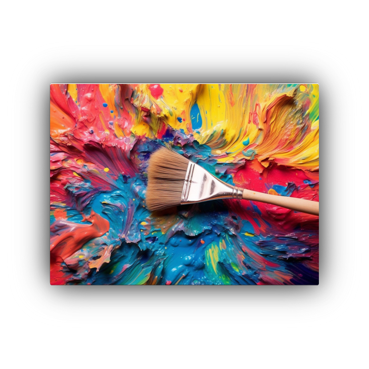 El Cuadro Pincel con Pintura Arcoíris sobre Lienzo en tonos fantasia como azul marino, amarillo claro, coral, carmesí, lila, verde azulado y menta, es perfecto para dar un toque de color y modernidad a cualquier ambiente Calidad premium y envíos express a regiones
