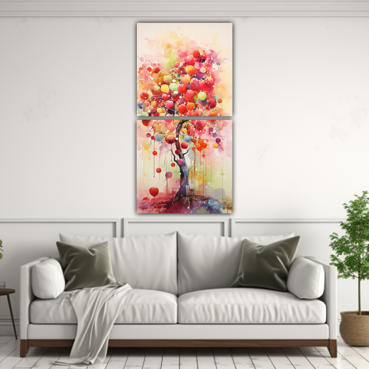 Este cuadro será el punto focal perfecto para tu sala de estar Colócalo sobre un sofá de tonos neutros para resaltar los colores intensos del árbol frutal rojo Combínalo con cojines en tonos coral o carmesí para crear una atmósfera cálida y acogedora