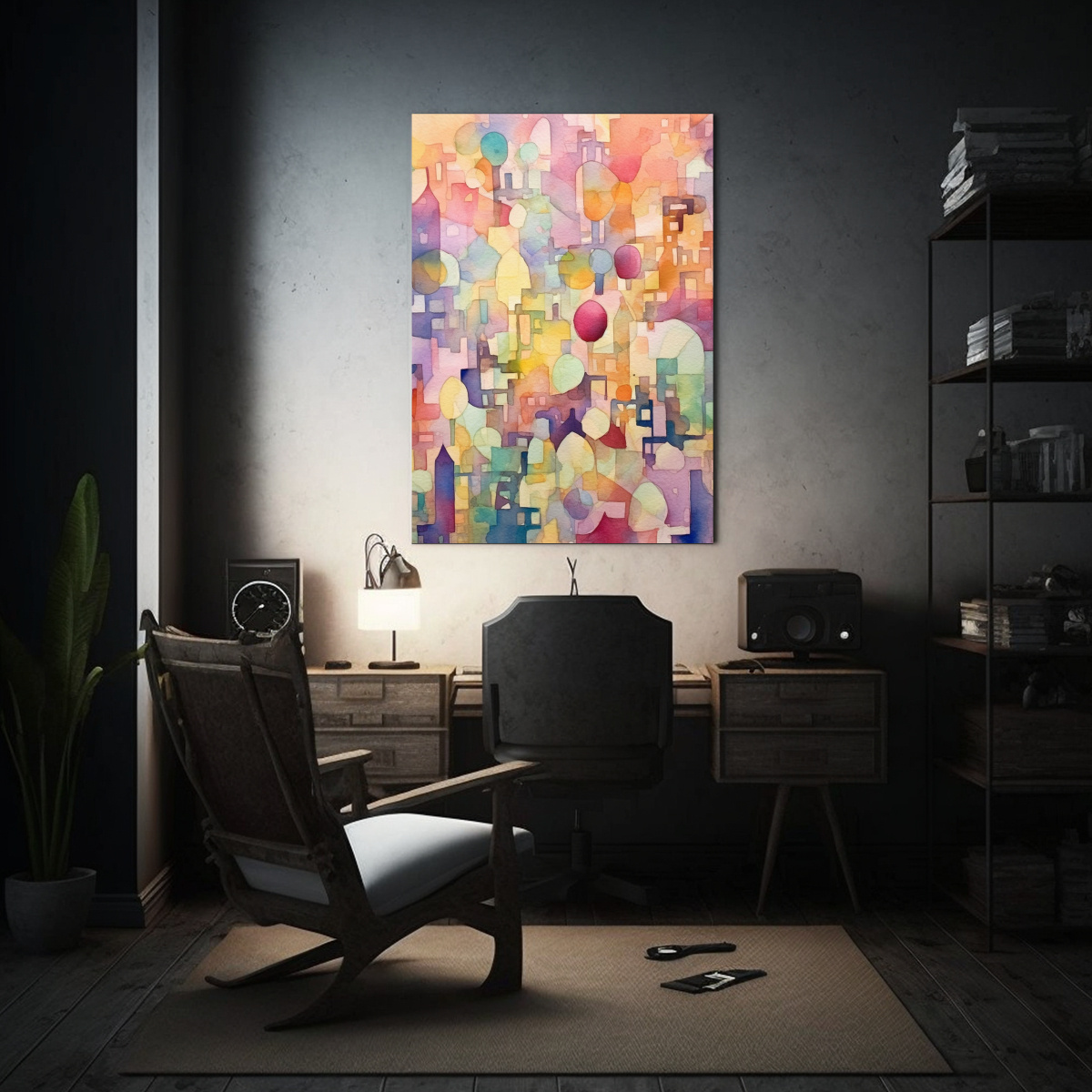 Este cuadro abstracto acuarela de colores ciudad sería perfecto para decorar una sala de estar moderna Colócalo sobre un sofá de color neutro para crear un contraste llamativo Complementa el cuadro con cojines en tonos plateados, azules y grises para lograr una combinación armoniosa Agrega una alfombra en tonos carmesí y coral para darle calidez al espacio ¡Con este cuadro, tu sala de estar se convertirá en el centro de atención!