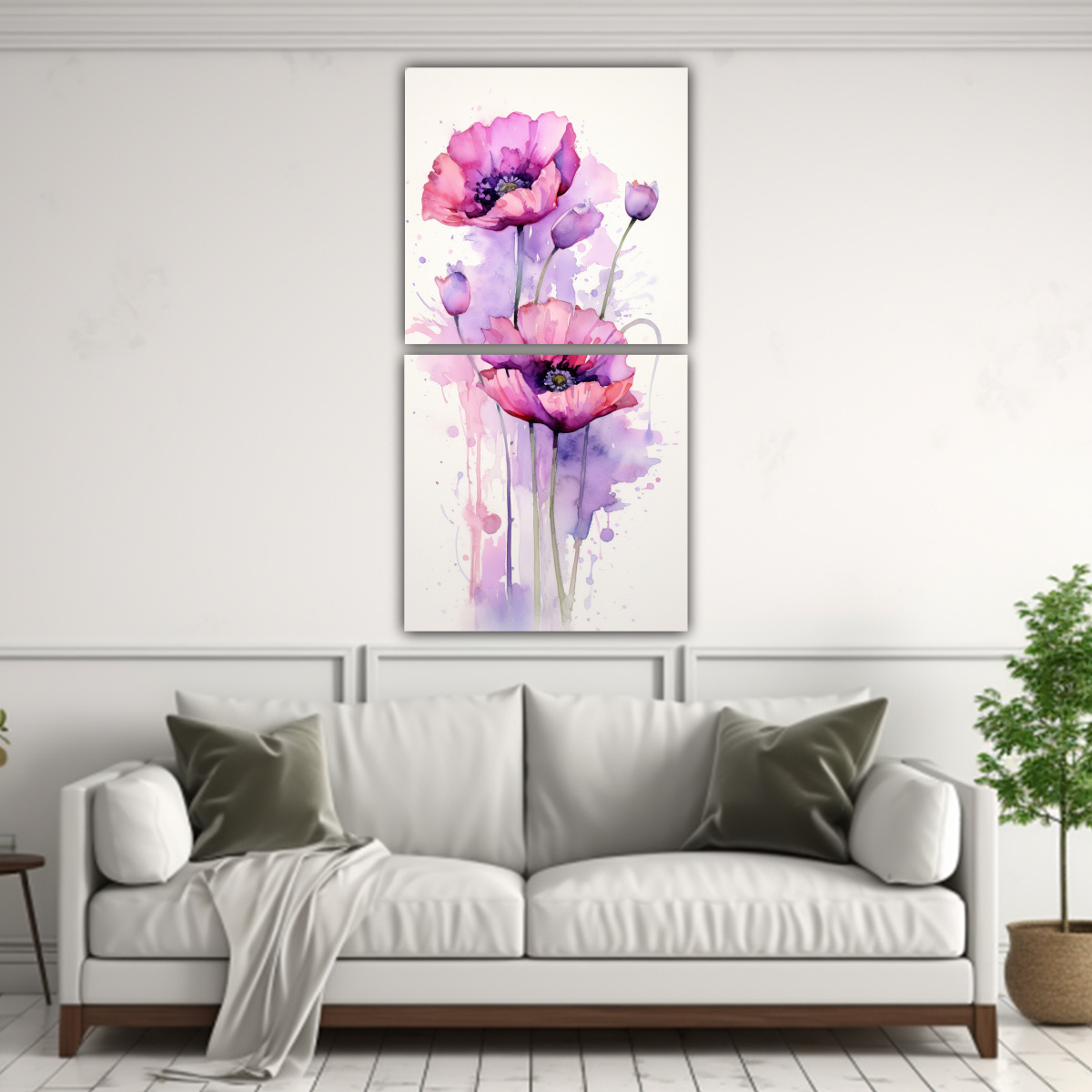 DecoCuadros ofrece un cuadro de pintura abstracta en acuarela con flores de amapolas púrpura sobre tela de alta calidad y bastidores de madera Los colores principales del cuadro son azul marino grisaceo, gris, beige, lila, carmesí y plateado Nuestros cuadros destacan por su diseño exclusivo, la mejor calidad del mercado y los precios más económicos Además, ofrecemos entregas rápidas y gratuitas en Santiago y envíos express a regiones Añade un toque de elegancia a tu hogar con esta hermosa pintura abstracta