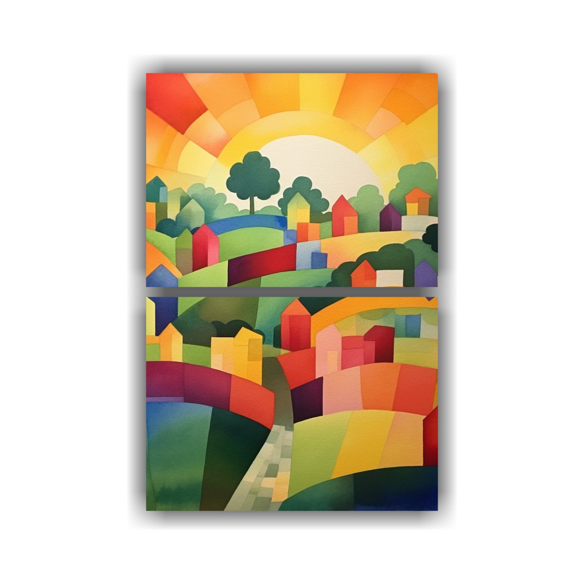 Este cuadro es perfecto para darle un toque de color y movimiento a tu sala de estar Puedes colocarlo sobre el sofá principal, creando un punto focal que llamará la atención de tus visitas Combínalo con cojines en tonos azul marino y menta para lograr una armonía en la decoración Además, puedes complementar el ambiente con cortinas grises y accesorios en tonos plateados para darle un toque de elegancia ¡No esperes más y adquiere esta exclusiva pintura abstracta acuarela surrealista movimiento de granja en DecoCuadros!