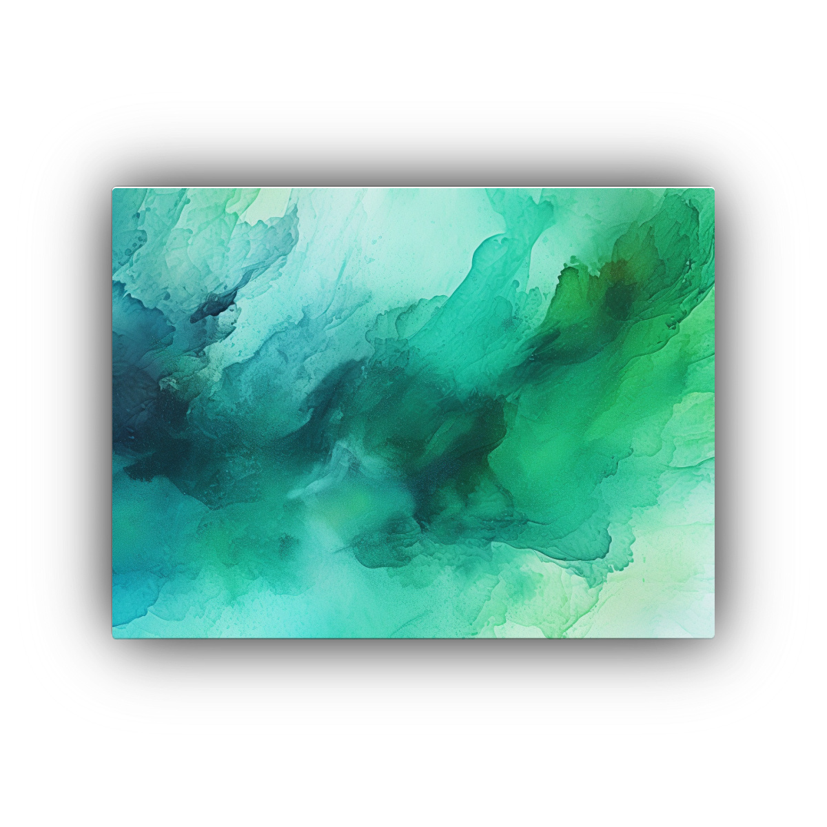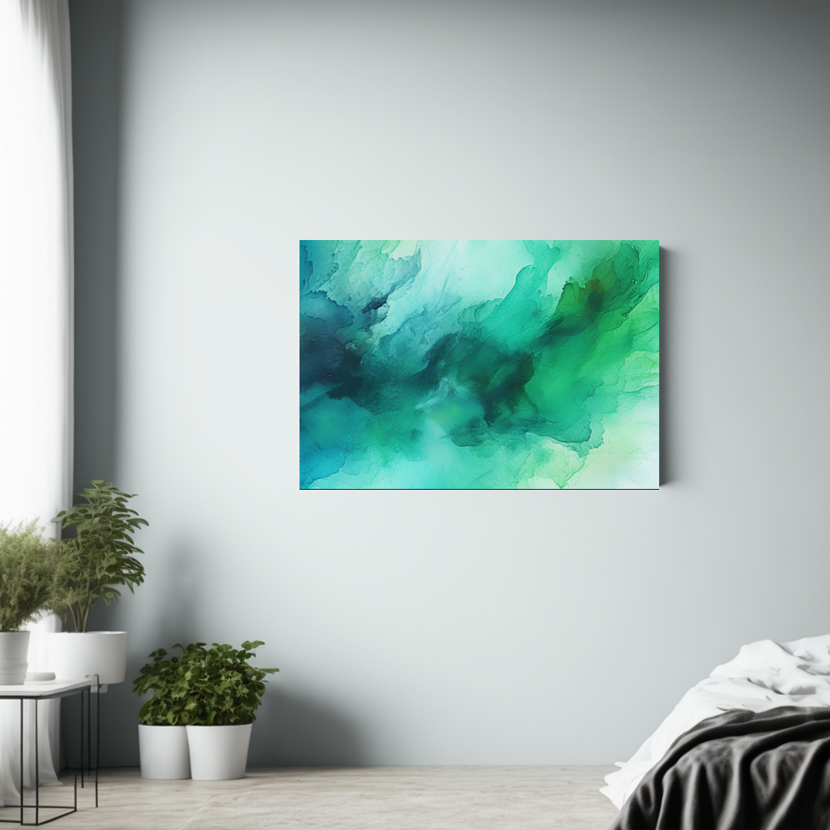 Este Cuadro Abstracto Acuarela Teal y Verde es perfecto para realzar una sala de estar contemporánea o un estudio creativo Colócalo sobre un sofá gris para resaltar sus tonos plateados y azules, creando un ambiente sofisticado y relajante
