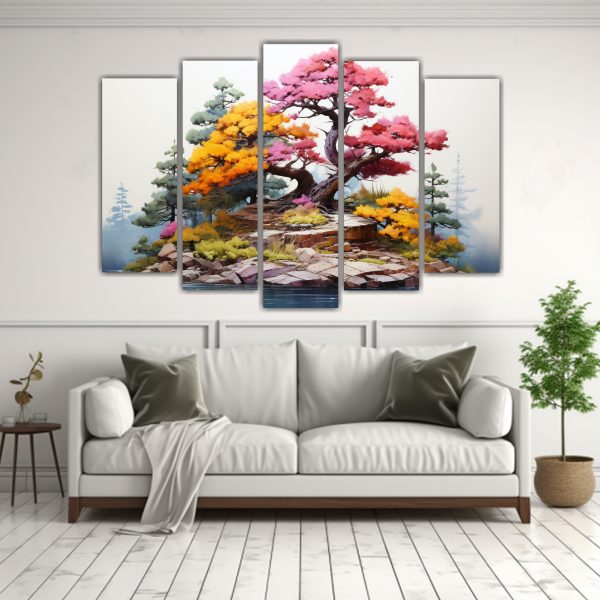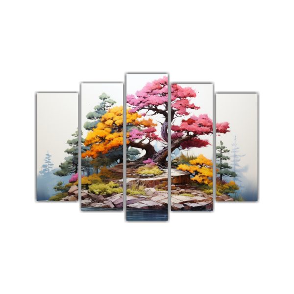Pintura Abstracta árbol Pino Bonsái Amarillo Y Rosa En 5 Cuadros