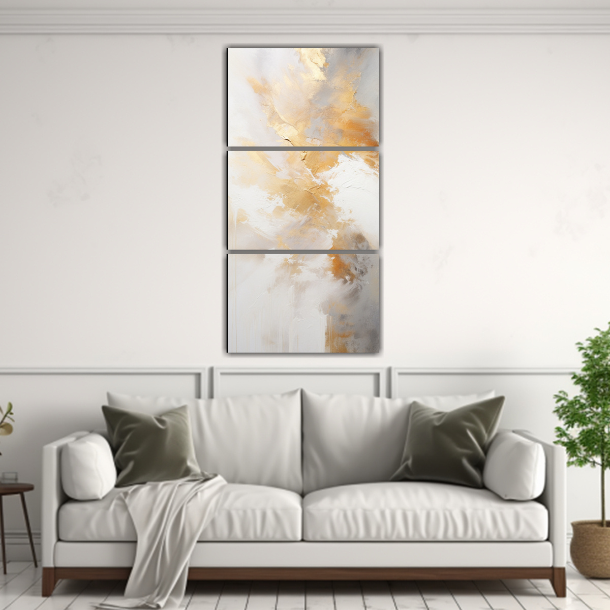 Este cuadro abstracto de fondo blanco con salpicaduras doradas es perfecto para decorar tu sala de estar Combina a la perfección con muebles de colores neutros como beige o gris, creando un ambiente moderno y sofisticado Colócalo sobre el sofá principal o en una pared vacía para darle un toque de estilo y elegancia a tu espacio ¡Será el centro de atención y dejará a todos impresionados!
