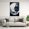 Este cuadro de pintura abstracta en blanco, negro y azul sería perfecto para decorar un salón moderno Puedes colocarlo sobre un sofá gris oscuro para resaltar los tonos plateados y negros del cuadro Además, puedes complementar la decoración con cojines azul marino grisáceo para lograr una combinación armoniosa El resultado será un ambiente elegante y sofisticado, donde el cuadro será el centro de atención