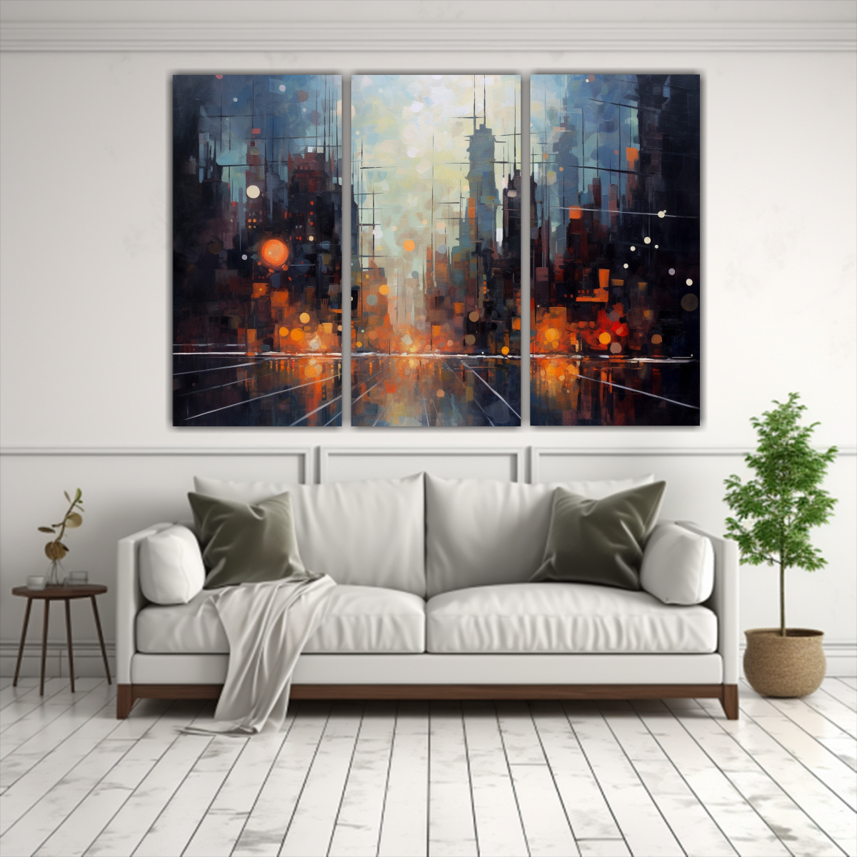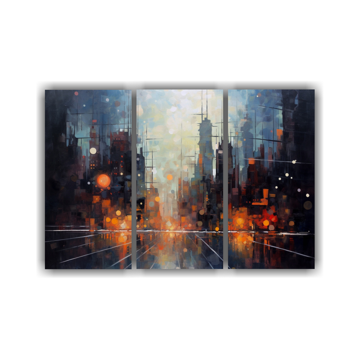 Pintura Abstracta Ciudad Nocturna: Set 3 Artes Pared Moderno.