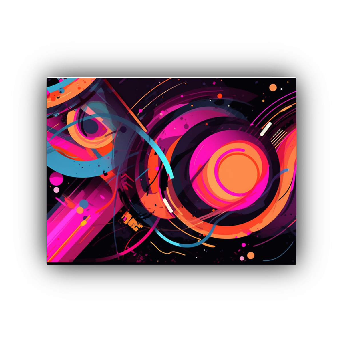 El patrón intenso y el espacio abstracto con líneas neón y círculos hacen de este cuadro una opción moderna y llamativa para decorar tu espacio Entregas rápidas y gratuitas en Santiago, envíos express a regiones disponibles