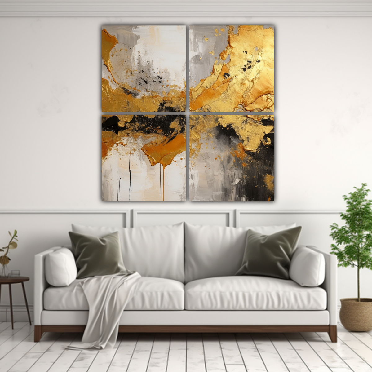 Pintura Abstracta Con Salpicaduras De Oro: 4 Telas En Bastidor De Cuadro Y Reflejo