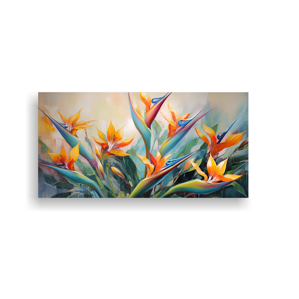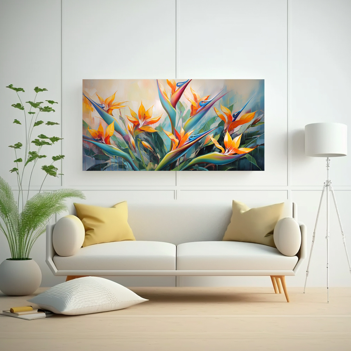 Este cuadro abstracto de flores ave del paraíso sería perfecto para darle vida a tu sala de estar Colócalo sobre una pared blanca para que los colores resalten y combínalo con cojines en tonos similares para crear una armonía en la decoración de tu espacio