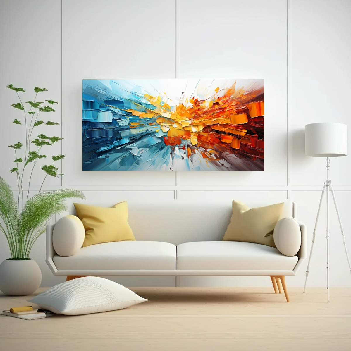 Este cuadro abstracto de alta calidad sería perfecto para decorar un salón moderno Puedes colocarlo sobre un sofá de color neutro para crear un contraste llamativo Además, combina muy bien con muebles de madera clara y accesorios en tonos plateados Agrega cojines con estampados abstractos en colores similares para completar la decoración ¡Este cuadro seguramente se convertirá en el centro de atención de tu espacio!
