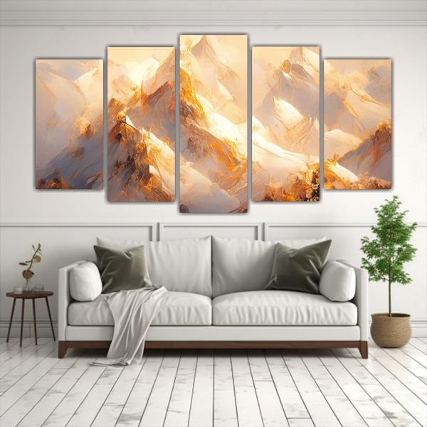 Coloca este cuadro abstracto de montañas nevadas con tonos dorados en la pared principal de tu sala de estar junto a muebles de cuero marrón y cojines en tonos cálidos para crear un ambiente acogedor y elegante Complementa la decoración con plantas verdes para un contraste natural