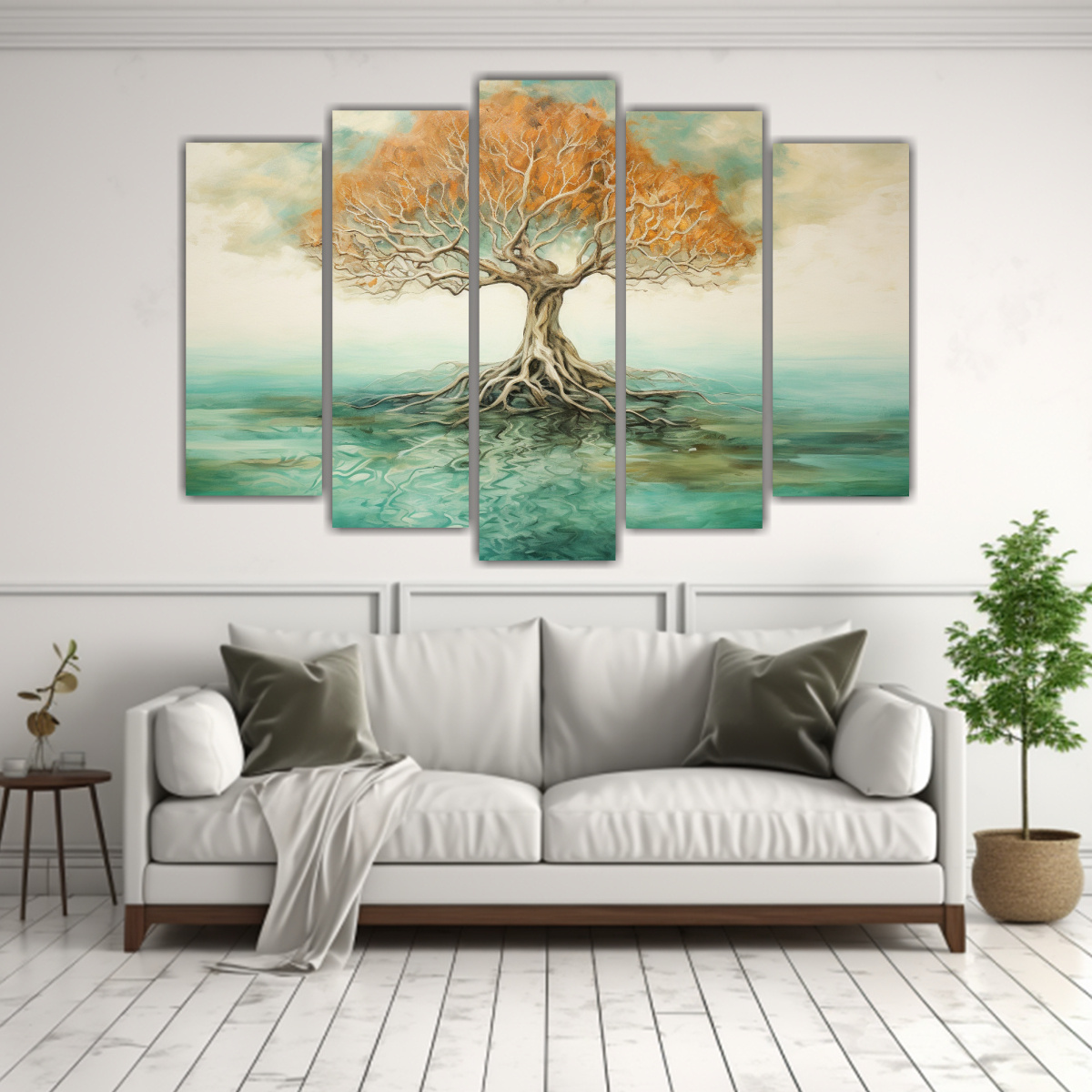 Renueva tu hogar u oficina con este impresionante cuadro abstracto de un árbol de mangle en cinco lienzos La combinación de colores azules, grises y tonos tierra aportará elegancia y modernidad a tu espacio Colócalo en la sala de estar para dar un toque sofisticado y natural