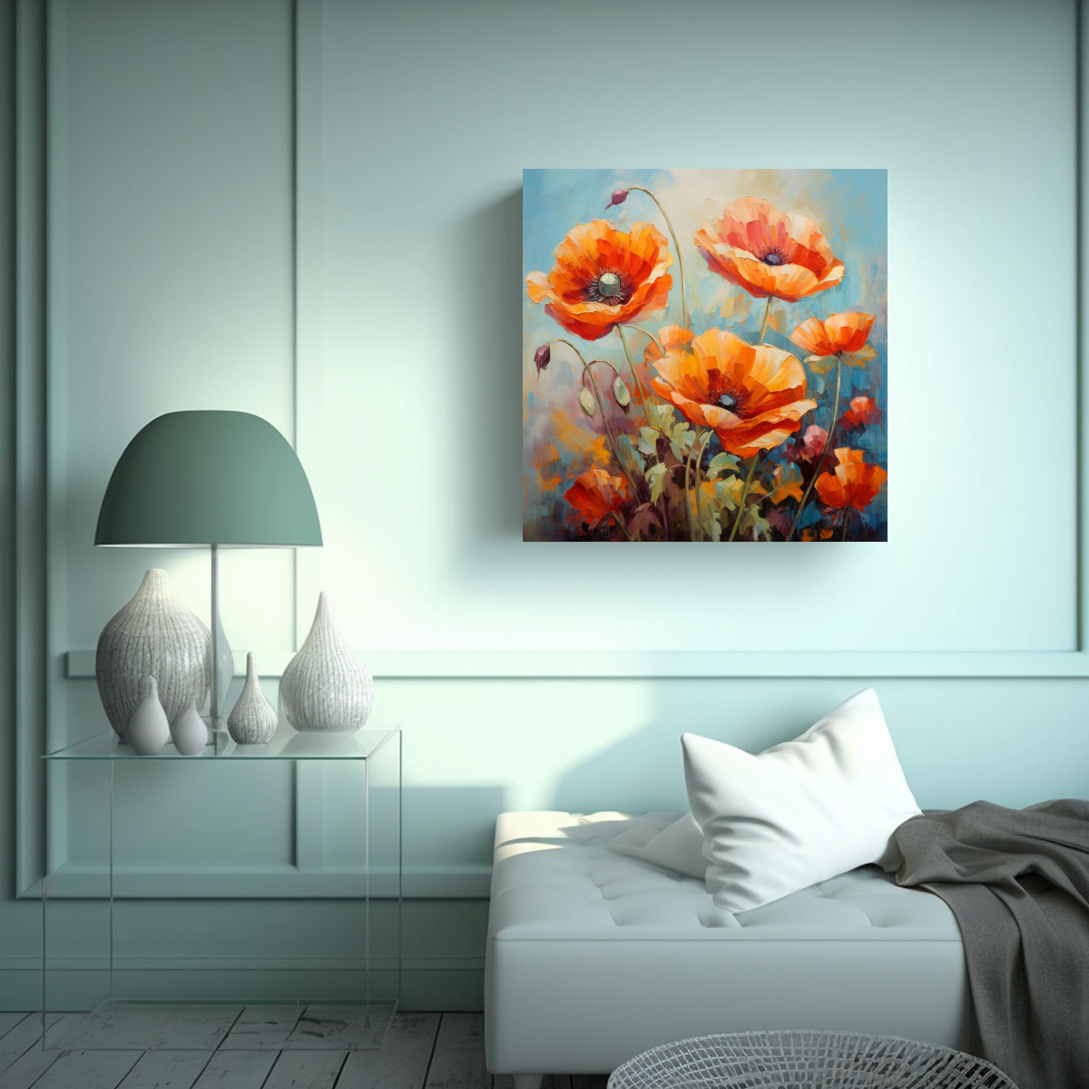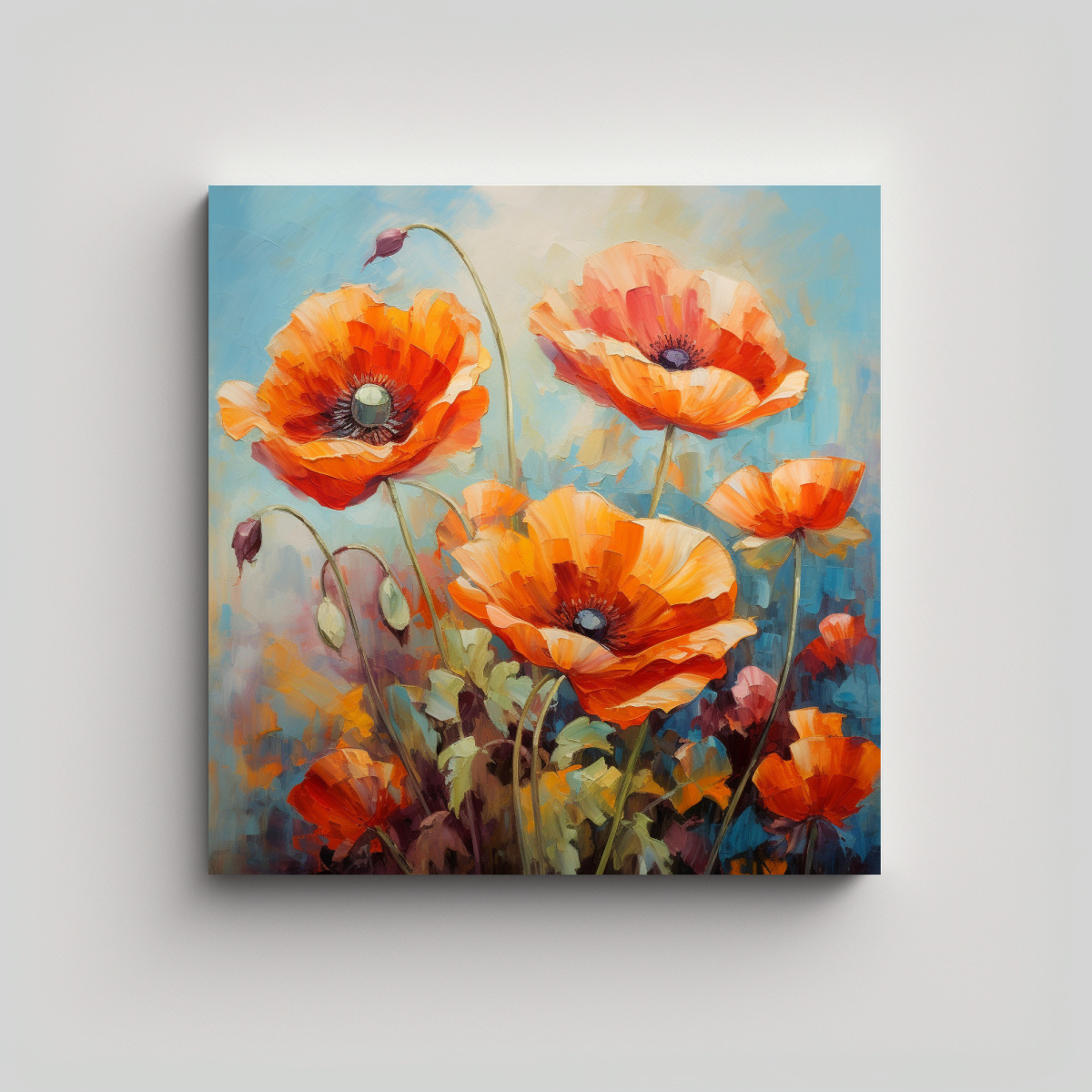 Este cuadro de amapolas abstractas en estilo Estilo óleo será el complemento perfecto para una pared de color blanco o gris claro Colócalo en tu sala de estar sobre un sofá gris o en tu dormitorio sobre la cabecera de la cama para crear un ambiente relajante y lleno de estilo Combínalo con cojines en tonos azul marino y gris, y agrega algunos toques de coral en accesorios decorativos como jarrones o velas Esta combinación de colores y elementos creará un ambiente moderno y sofisticado en tu hogar