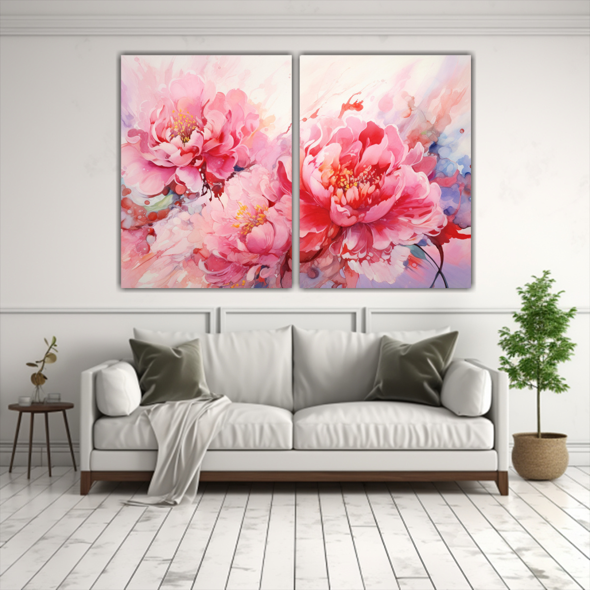 Pintura Abstracta De Amapolas En Rojo Y Rosa En 2 Telas En Bastidor Horizontal