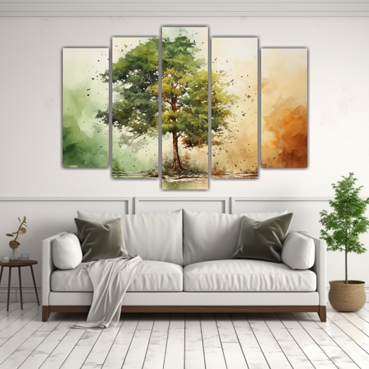 Este cuadro abstracto de árbol en tonos verde y dorado sería ideal para colocar en la sala de estar sobre un sofá gris, creando un contraste elegante y moderno También puede ser el punto focal en un pasillo amplio para agregar sofisticación a tu espacio ¡Combina colores y crea un ambiente único!
