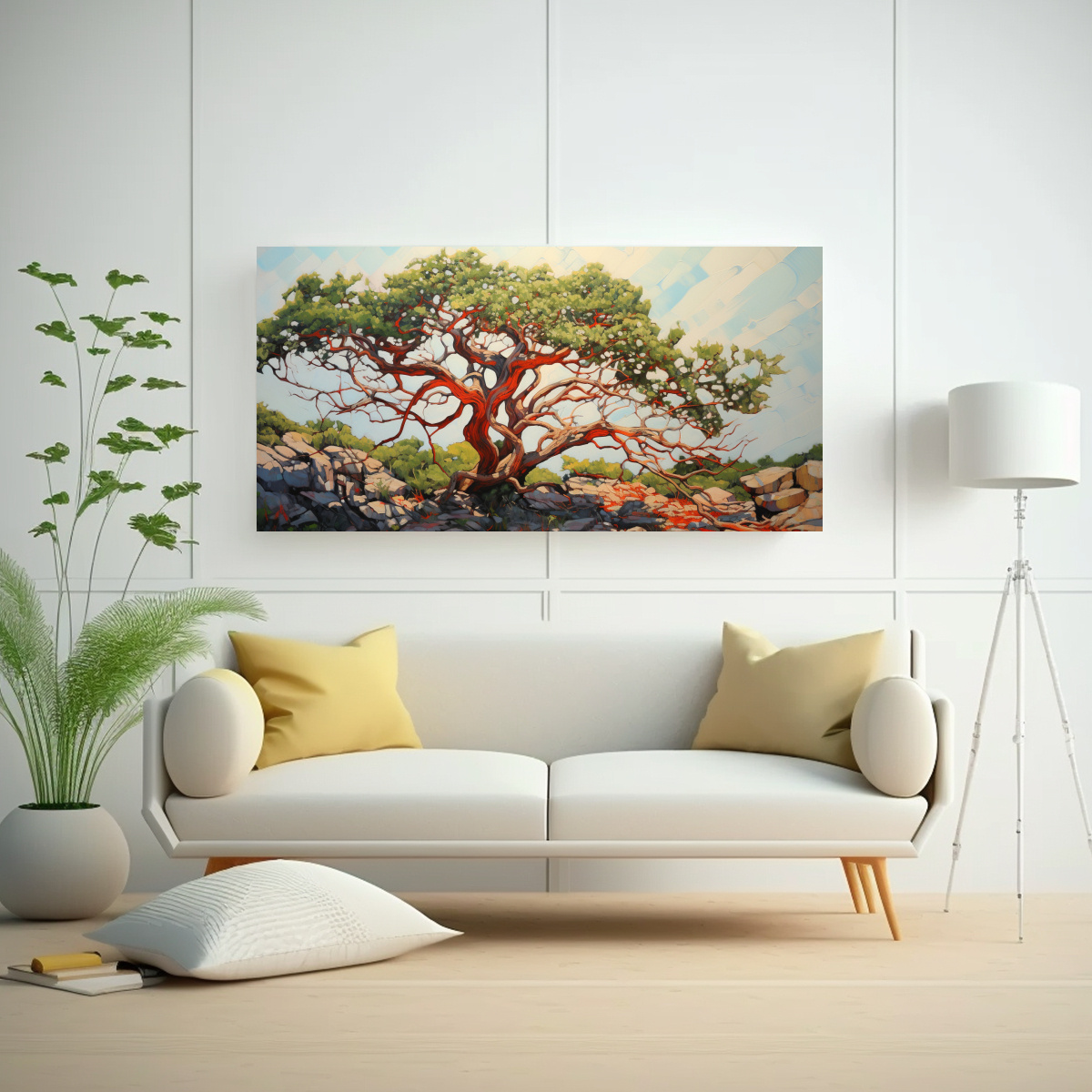 Este cuadro abstracto de árbol de madroño es ideal para decorar tu sala de estar Combínalo con muebles en tonos neutros como beige o gris y agrega cojines en tonos azul marino y plata para crear una atmósfera elegante y sofisticada Colócalo sobre el sofá o en una pared vacía para resaltar su belleza y darle vida a tu espacio