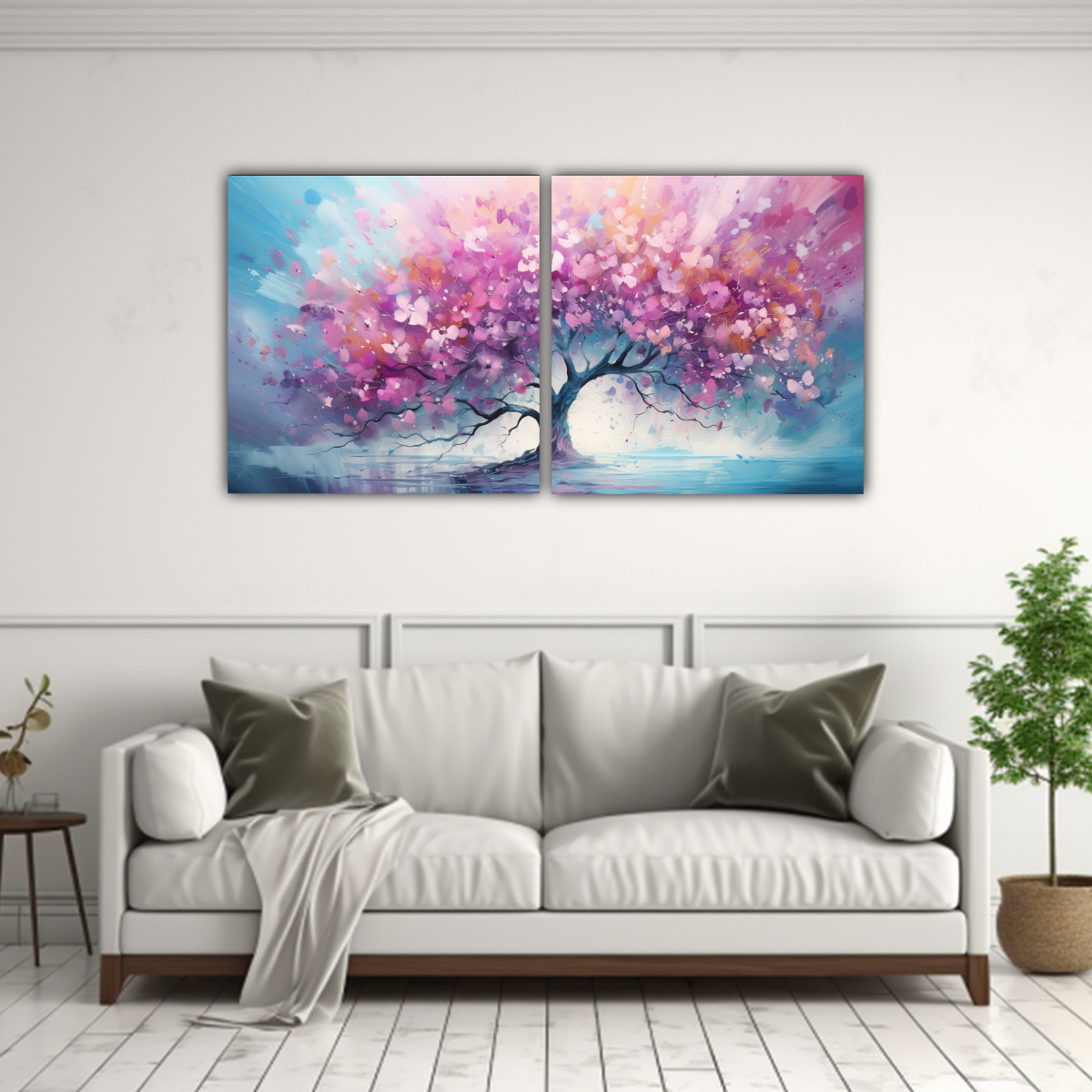 DecoCuadros te ofrece el cuadro ‘Pintura abstracta de árbol tropical en colores turquesa y rosa’ Con colores como Azul Marino grisaceo, Gris, Beige, Rosado Claro, Morado, Plateado, Lila, Carmesí y Turquesa Calidad superior y precios económicos