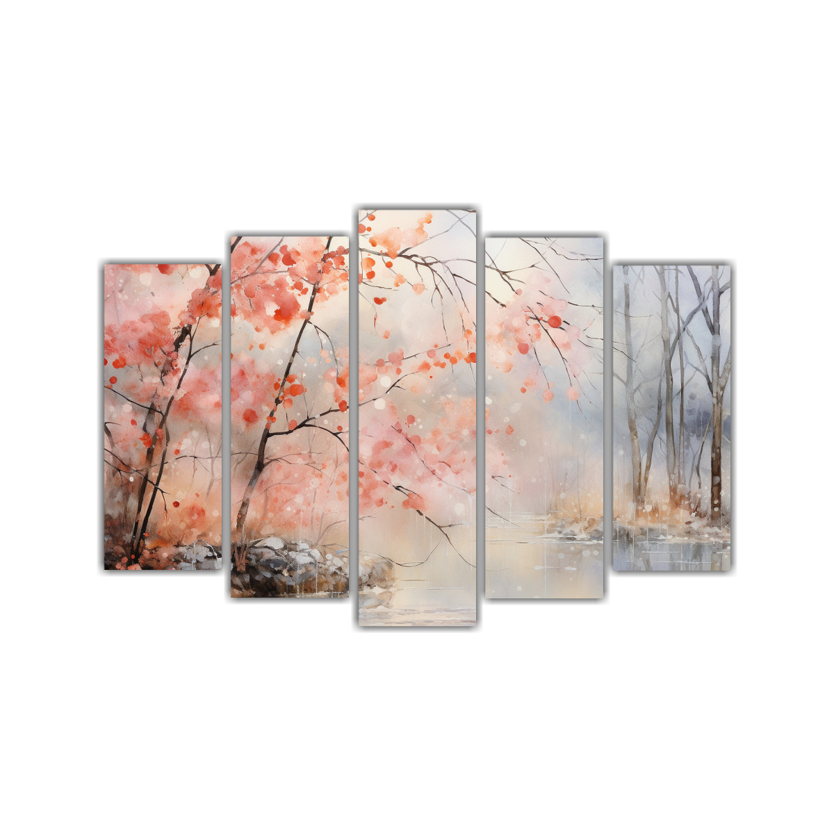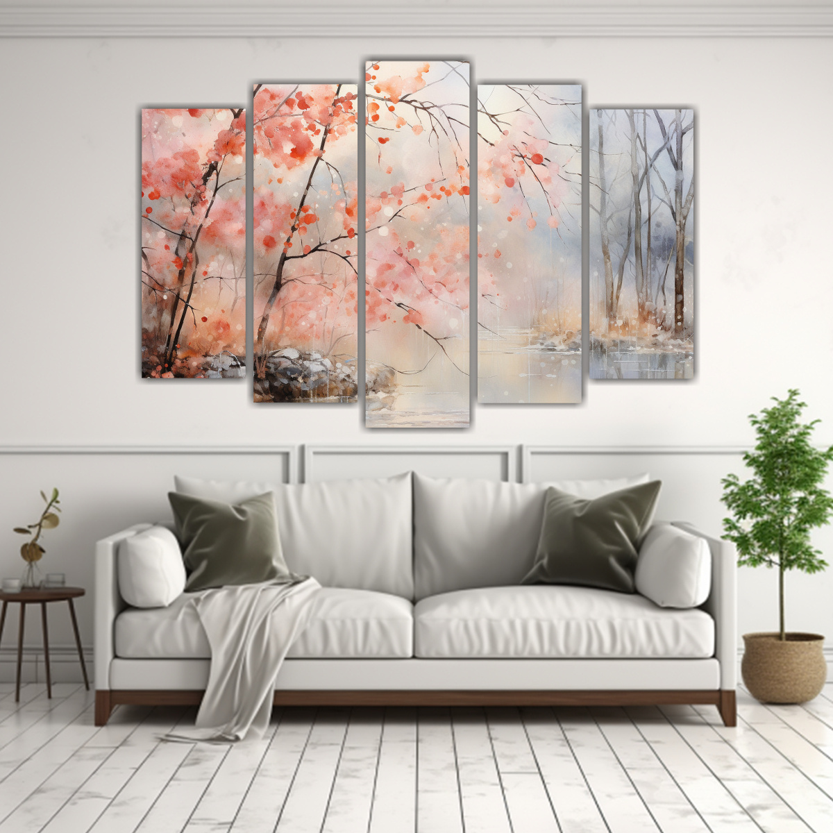 Pintura Abstracta De árboles De Arce En Colores Suaves: 5 Lienzos Intensos.