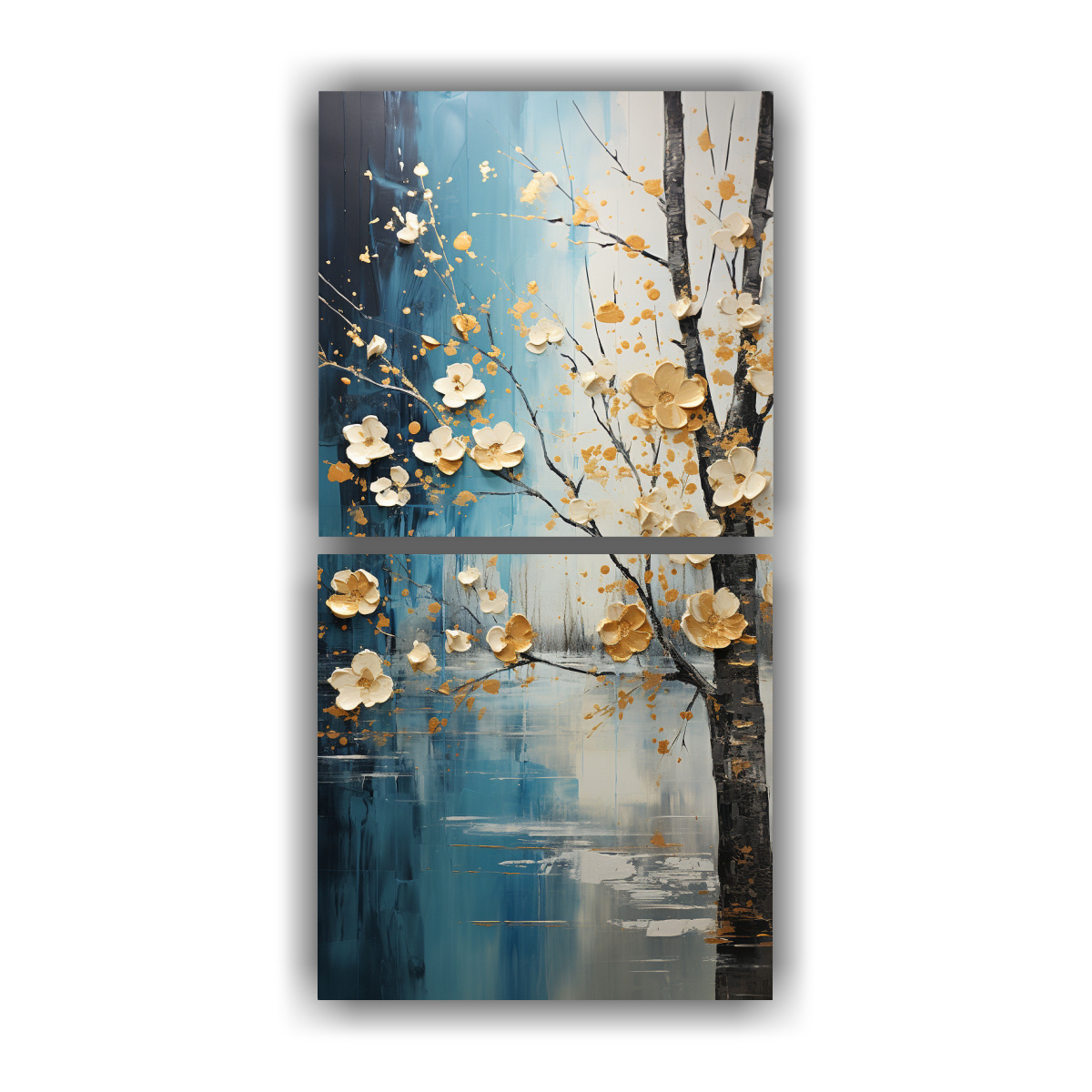 DecoCuadros te trae un set de 2 canvas con una impresionante pintura abstracta de árboles en tonos plata y blanco Nuestros cuadros decorativos son impresos en tela de alta calidad y cuentan con bastidores de madera, lo que garantiza durabilidad y resistencia Los colores azul marino grisáceo, plateado, gris, turquesa, dorado, coral y mostaza se combinan de forma armoniosa para crear una pieza única que aportará estilo y elegancia a tu dormitorio